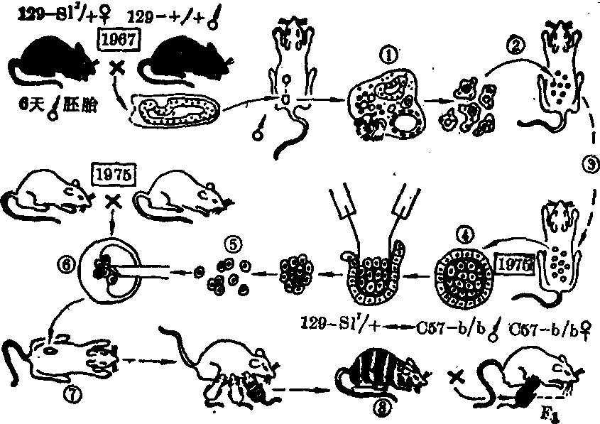 畸胎癌细胞注入胚泡后移植于寄养母鼠可娩出嵌合体
