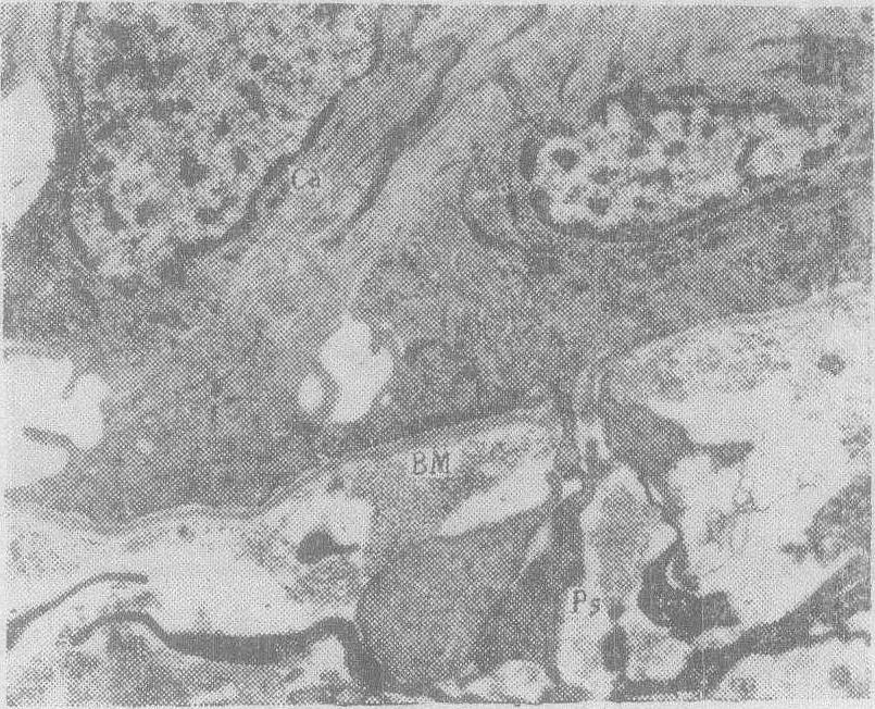 图1 癌细胞(Ca)表面有假足(Ps)突起,穿破基膜(BM),伸入间质×12000 (1) 纤维细胞及成纤维细胞: 在肿瘤生长过程中,可见有纤维细胞或成纤维细胞向瘤细胞靠拢。瘤细胞浸润的方向常与纤维细胞或胶原纤维的长轴平行,有时纤维细胞有增生现象,说明成束纤维组织对瘤细胞的移动有一定屏障作用。但也可看到瘤细胞邻近的纤维细胞发生变性及破坏,基质变得稀疏,局部的胶原纤维可以消失。 (2) 毛细血管及其内皮细胞: 在瘤组织邻近的毛细血管的内皮细胞,常可见局部破损,且有血细胞渗出;溃破处也可见血小板凝集。此外,毛细血管的内皮细胞有肿胀现象,使血管腔变窄,腔内有红细胞聚集形成红色血栓,或血小板聚集成白色血栓。有的内皮细胞表面有起伏不平的凸起,核有时也有畸形。有的血管腔内可见侵入的瘤细胞,瘤细胞常变形,核位于细胞的一端,可能是通过较小血管的裂隙而进入之故。 (3) 淋巴管: 在瘤组织邻近的淋巴管常扩张,内皮细胞的联结处有的已分开,可能成为瘤细胞进入淋巴管的通道。有时在淋巴管内见到的瘤细胞已发生变性。 (4) 神经组织: 在肿瘤组织邻近有时可见神经纤维,神经纤维外可见髓鞘; 中心的轴浆内的线粒体呈现明显的肿胀,有的区域髓鞘层次变得模糊不清。 (5) 淋巴细胞: 在肿瘤组织内或肿瘤邻近的间质内,可见多少不等的淋巴细胞。此种淋巴细胞的胞质常较丰富,并有伪足样突起,胞质内线粒体亦较多,胞核的核膜常凹陷,核内异染色质丰富,少数可见核仁。在瘤组织内或其周围,与淋巴细胞相邻的瘤细胞,有时可见破坏现象即所谓“溶癌现象”(图2)。此种现象在鼻咽癌中比较明显,其他肿瘤如胃癌、肠癌、肺癌、肝癌及脑内肿瘤虽亦可见到,但程度更轻。