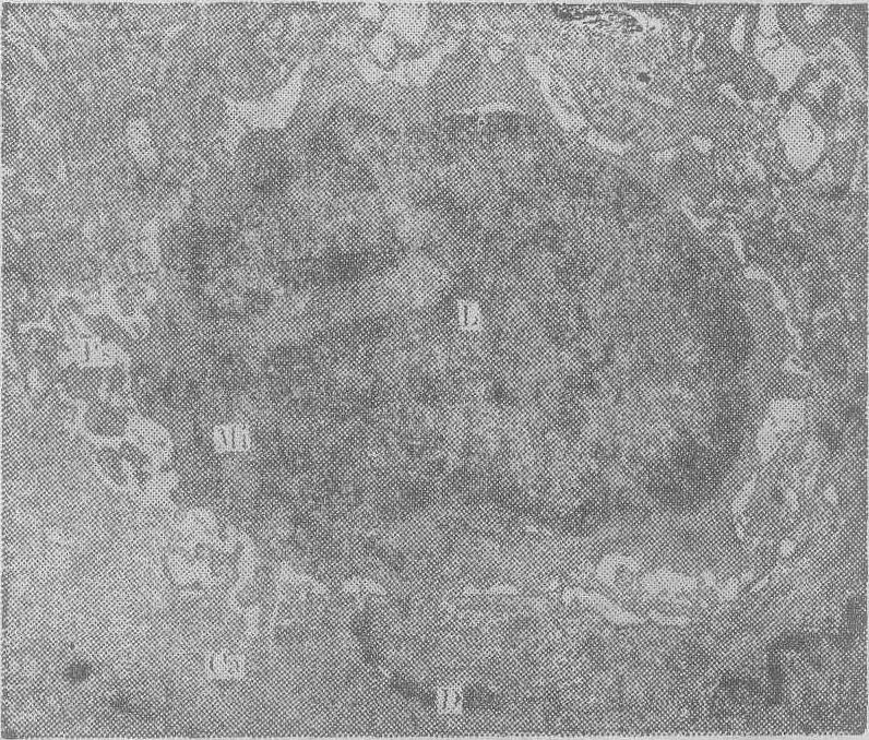 图2 淋巴细胞溶癌现象。图中心为一淋巴细胞(L),细胞表面有假足突起(PS),癌细胞相邻部有破坏。Mi为线粒体,D为桥粒×15000 (6) 巨噬细胞: 在肿瘤细胞之间,或肿瘤团块的边缘,有时可见巨噬细胞。与巨噬细胞邻接的瘤细胞,有时可见局部破坏现象。 (7)浆细胞: 出现在肿瘤组织的邻近,多少可以不等。其胞质内的粗面内质网常有明显扩张,在核与胞质的间隙中,可见中等电子密度的细颗粒状物。核较大,可见核仁,说明其合成功能活跃。 (8)在瘤细胞间或其邻近,尚可见中性粒细胞、嗜酸粒细胞及肥大细胞。 除了上述癌旁组织的各种改变外,有的瘤细胞内有大量溶酶体,有时也有髓样变性出现,甚至可见整个细胞坏死。在间质细胞中可见溶酶体增多的现象。 ☚ 肿瘤细胞的超微结构 肿瘤的超微结构与鉴别诊断 ☛ |