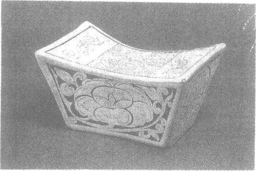 | 释义 | 登封窑刻剔花牡丹纹瓷枕 登封窑刻剔花牡丹纹瓷枕北宋。高10.7厘米,面径长14.3厘米。上海博物馆藏。登封窑位于河南省登封县,始烧于唐而盛于宋。除珍珠地划花外,刻花、剔花也是登封窑装饰的常用手法。此枕四面呈倒梯形,枕面两头上翘,形似银锭。制作时在瓷胎上施一层厚厚的白色化妆土,再用刻花和剔花方法制作花卉图案。刻花是在化妆土上直接刻画,露出的赭红色胎形成漂亮的图样。剔花是用刀剔去花纹以外的花妆土,露出胎色衬托着乳白色的花朵。两种装饰手法不同,效果迥异。前者花纹纤细、流畅;后者粗犷、豪放。此件瓷枕的各面装饰是两种手法并用,两种风格并存,使此器益显其绚丽多姿,也体现了制作者的创新。