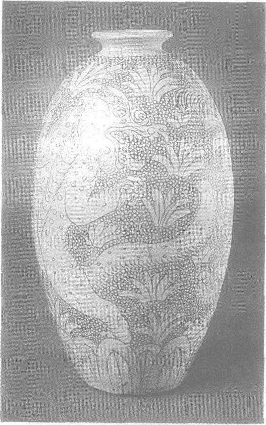 宋。高31.9厘米,口径7.2厘米。北京故宫博物院藏。宋代流行于河南、山西等地的珍珠地刻花装饰,是吸取唐代金银器的錾花工艺而开创的一种新的釉面装饰。此瓶即为河南省登封窑的一件珍珠地刻花器。侈口、圆唇,体似橄榄形,器身的主花纹是两只猛虎,张牙舞爪地斗于草丛之中。刻划人技术高超,两虎的形神通过灵活有力的线条充分显现出来,使观者似乎耳闻咆哮、喘息和草丛被践踏的沙沙声。在纹饰的空隙处划满珍珠般的圆圈,将两虎衬托得更为清晰。纹饰均填褐彩,覆以白釉,使此瓶显得洁净、肃穆,不愧为登封窑的名作。