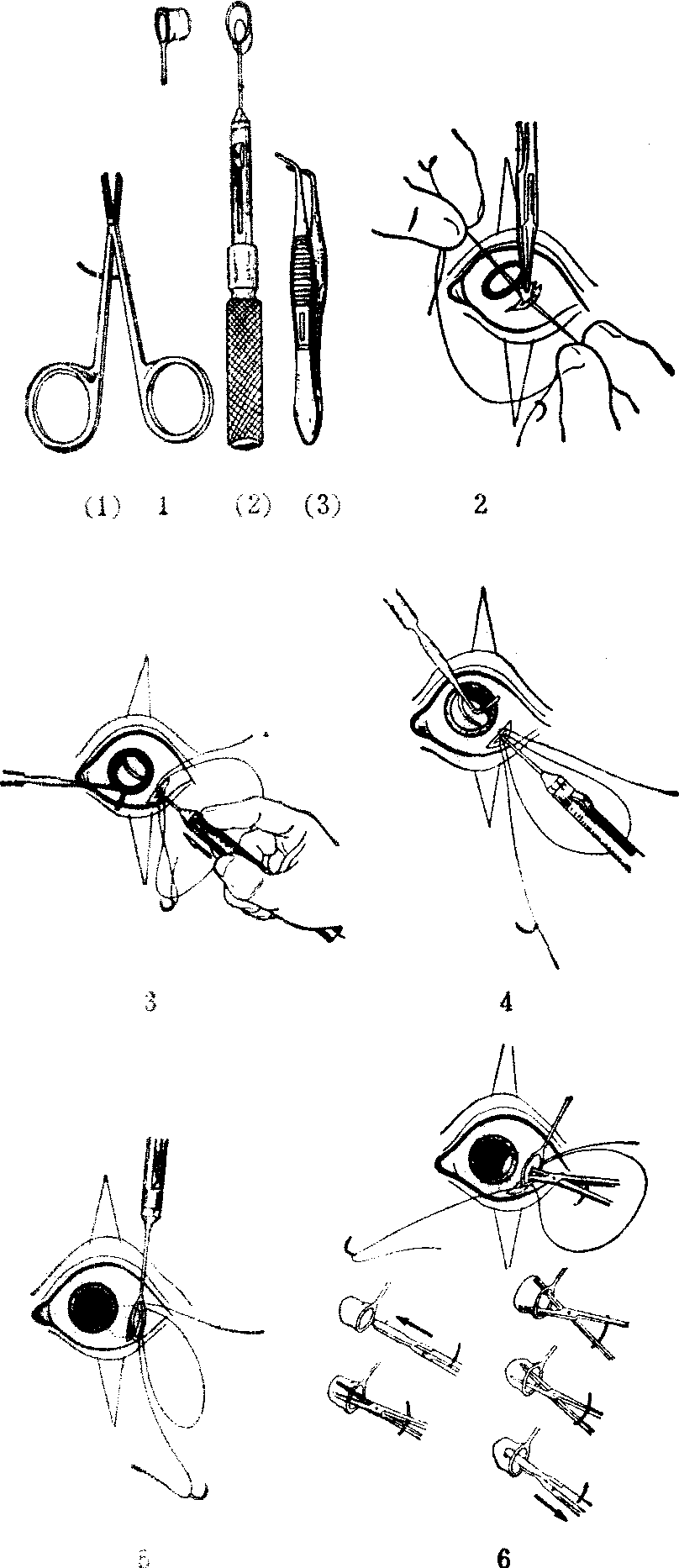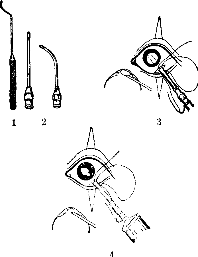 白内障针拨吸出术 1.断带针 2.白内障吸出针头 3.4.吸出白内障 分次吸出法: 用于无核的白内障。巩膜切口长约3毫米,方法基本与一次吸出法相同,选用8号针头,将针头向晶体赤道部刺入,针头斜面向上,背面接近晶体后囊,在位置恰当后,即行吸出似浆样的晶体皮质。皮质吸出后,囊皮皱缩卷曲,有时因卷曲的囊膜包藏一部分皮质,吸出有困难时,可将针管内的盐水缓缓注入晶体囊内,使之重新充盈成扁圆形。同时针头可小心地在囊膜内边注射盐水边扰动,使残留皮质与盐水混合,便于吸出。当皮质基本吸尽后,囊膜往往不易被吸出,即出针,将针管内的皮质洗尽,重新吸取干净的灭菌生理盐水等量,换上较粗的白内障吸出针头,重新进入眼内,将针紧贴晶体后囊,控制好针芯活塞,稍用力将囊膜吸入针内即可,出针时有时因切口附近悬韧带未断,尚有部分囊膜和韧带在切口处不能全部吸出,助手可用晶体镊将其挟住取尽。如在吸出囊膜的过程中,有少量皮质残留前房时,再用针头之斜面贴住皮质将其完全吸出,即可出针。如有小块囊膜在虹膜后周边部,可不予处理。若在瞳孔区,可用晶体囊镊挟出。 处理切口,一次吸出法者,处理同套出术;分次吸出者,处理同针拨术。 注意点: 在分次吸出法中,助手固定角膜缘6点处球结膜不宜放松,以免球结膜切口与巩膜切口错位,使术者进针困难,固定镊不应挤压眼球,以免造成玻璃体外溢。 适应于做针拨吸出术的白内障,大多皮质软,悬韧带坚韧,为了防止拨障断带过程中晶体囊破,在选用拨针时,针的头部宜宽些,它与晶体的接触面大,在拨障断带时囊膜不易破裂。 抽吸时,要随时注意针管上的刻度,一般吸出白内障后,针管内容的量只允许增加0.35毫升左右,因为一般晶体的体积约有0.2毫升,如超过此量,就有误吸玻璃体的可能。 如在吸白内障囊或残留皮质之前,误吸房水,使前房变浅或消失,则应在前房内注入少量灭菌生理盐水,恢复前房深度后再吸。否则易将玻璃体吸出。 在吸白内障或吸囊膜时,当白内障已基本吸入针头内时,就要迅速停止抽吸,以免误吸虹膜、角膜内皮等组织。 术后护理 针拨术患者术毕可步行回病房。枕头略高平卧,普食,生活自理。双眼同时手术者,须予照顾。瞳孔未缩小到正常前不宜低头,以免玻璃体脱入前房,术后每天换药一次,点抗生素、激素眼药水,刺激症状较重者,加点1%阿托品眼药水,一般术后第三天可以去敷料,第五天可以试配镜和出院,一个月可以正式配镜。 套出术和吸出术者,如术中经过顺利,术毕送回病房后,护理同针拨术后。如术中有并发症,或双眼同时手术者,必须予以一级护理。术后5~6天去结膜缝线,巩膜缝线埋藏于结膜下不拆。二个月后可以配戴眼镜。 并发症 可发生在术中及术后,应加预防。 术中并发症及处理 内障浮起:晶体位置过高,是由于某些方位的悬韧带未断所致,如4点处未断,晶体在瞳孔区颞下方位置较高;如8点处未断,则瞳孔区鼻下方位置较高。两者均须重复上述拨障手法,以断4点或8点处悬韧带。 晶体破裂: 易发生在膨胀期和过熟期白内障。手术时将拨障针误入晶体囊内,或过分压挤晶体而造成;在套出术中,当驱赶白内障进套时,斜视钩用力不当,或关闭套口过早过紧等,均可发生。如在针拨术中,发生后应立即停止拨障,改做白内障针拨套出术,先将晶体核取出,并用圆钝的粗针头吸出皮质;如在套出术中发生,将晶体核套出后,拉紧巩膜缝线,然后吸出皮质。 虹膜睫状体出血: 可由睫状体平坦部切口小于巩膜切口,在进针时,造成撕裂伤引起出血。因此在刀片切穿巩膜睫状体平坦部后将刀刃向上略挑起,使睫状体切口不小于巩膜切口。或因针头误入睫状体下腔,损伤睫状体导致出血。或针头翘得太高,推挤睫状体及虹膜根部过重,甚至造成虹膜根部断离。引起前房出血时,需将拨障针立即后退,纠正针头位置。套出术中还可见于睫状体平坦部的切口反小于巩膜切口,则在进套出器时容易将睫状体推挤撕裂,引起睫状体出血,或因套出器在眼内的位置不当,如翘得过高,挤压睫状体与虹膜组织,也会造成出血。 玻璃体外溢: 如球后封闭麻醉、轮匝肌麻醉未达到预期目的,眼球转动,眼睑压迫眼球所致,或进套出器时推挤巩膜切口后唇,巩膜预置缝线牵拉不当,斜视钩在眼球外加压过重,均是造成术中玻璃体外溢的原因。 术后并发症及处理 继发性青光眼:一般见于针拨术,套出术后很少发生。主要是因术后瞳孔区玻璃体疝阻滞了房水的正常通道,引起眼压升高所致。是由房水进入玻璃体腔内,和瞳孔区的玻璃体前界膜完整两个因素形成的。为了防止玻璃体疝的形成,术中必须在瞳孔区下1/3处划破玻璃体前界膜,如已出现这类继发性青光眼,用扩瞳剂充分散大瞳孔,缓解玻璃体疝的阻塞;局部滴用激素,防止虹膜瞳孔缘和玻璃体疝发生粘连;口服50%甘油,如药物治疗无效,可采用划破玻璃体前界膜的手术方法。 虹膜睫状体炎: 常由于白内障皮质过敏引起。由于个体差异,临床表现亦轻重不同。其特点除一般虹膜睫状体炎的临床所见外,房水内有较多的浮游细胞,小块状皮质碎片,前房下半部有时可见皮质碎片沉积,玻璃体有轻重不同的混浊,如有皮质进入玻璃体腔,则混浊更为明显。一般来说,皮质碎片在前房较在玻璃体腔易于吸收。处理方法:术中发生晶体囊破裂后,已做相应的处理,前房残留皮质不多,术后可服菊花决明散(《原机