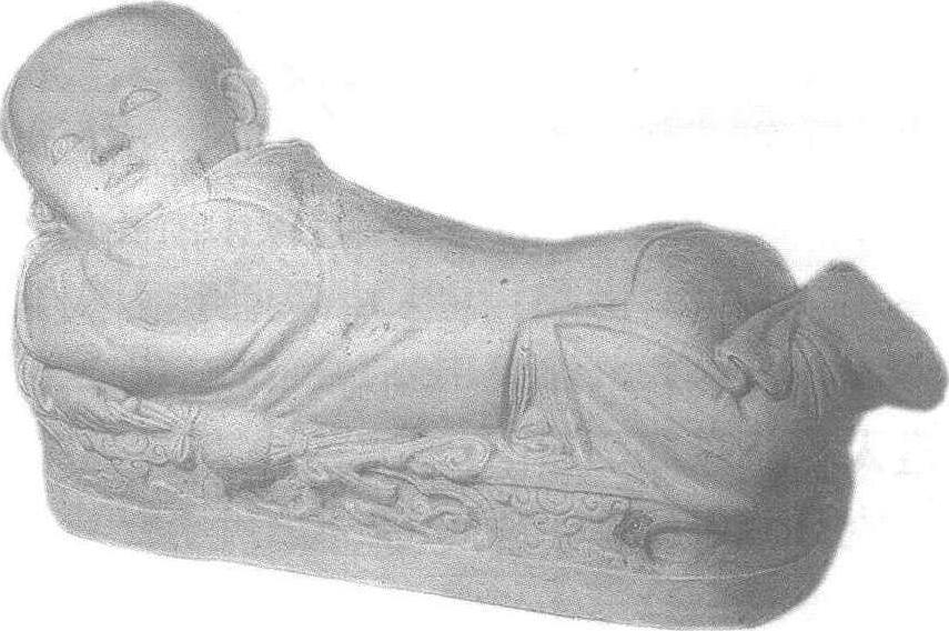 定窑宋白瓷孩儿枕 ☚ 影青雕塑孩儿持荷叶枕 童子垂钓枕 ☛ 白瓷孩儿枕 白瓷孩儿枕北宋定窑制品,现为北京故宫博物院珍藏。枕高18.3厘米,长30厘米,宽11.8厘米。造型为一俯卧的儿童,双臂抱拢,枕于头下,侧首上仰,双足拱起。以儿童俯卧形成的弯曲下凹的背部为枕面,构思巧妙,既可作实用品,又是一件完美的雕刻艺术品。儿童形象刻画细腻传神,脸部饱满,宽额大耳,眉毛高挑,双目圆睁,鼻子小巧挺直,小嘴鼓凸,把稚气未脱的童子形象表现得淋漓尽致,惹人爱怜。在头顶两侧各扎一髻,为我国古代儿童常见的“勃角儿”发式。儿童左手垫头,右手拿绣球,上缀丝绦蝴蝶结。身穿长袍,外罩背心,下穿肥裤,足着软靴。衣纹处理简洁流畅,疏密得体,很好地表现出衣物的质感,绣球及袍服上的花纹清晰可见。