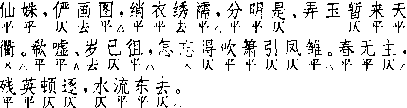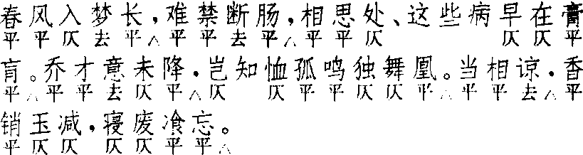 | 释义 | 白练序 白练序吴炳 《绿牡丹》 ![]() 前腔 换头 前人 ![]() 正格八句:4△,7△,7△。5△,7△。3△,4,4△。 换头格九句:2△,3△,4△,7△。5△,7△。3△,4,4△。 其二 梅鼎祚 《玉合记》 ![]() 前腔 换头 前人 ![]() 正格九句:3,7△,7△。2△,3△,7△。3△,4,4△。 换头格十句:2△,3△,4△,7△。2△,3△,7△。3△,4,4△。 其三 陆采 《怀香记》 ![]() 前腔 换头 前人 ![]() 正格八句:3,7△,7△。5△,7△。3△,4,4△。 换头格八句:5△,4△,7△。5△,7△。3△,4,4△。 其四 汤显祖 《牡丹亭》 ![]() 全曲九句:2△,3△,7△,7△。5△,7△。3△,4,4△。此曲见早期戏文《风流合三十》,连用四支,第二支起换头。后唯见《精忠记·省母》连用二支,第二支换头;但第一支正格首句已改为三字句。《南词新谱》词式用《风流合三十》,谓:“起句四字,乃此曲本调。自‘窥青眼’散曲出,词意兼到,而人争唱之,不知其失体也。吾宁舍彼而取此。”“窥青眼”散套,传高明作。明人传奇均以此曲后联〔醉太平〕,循环使用,一次为度。此种循环套式,作者甚多,其词式有四:第一式遵本调,正格首句四字,叶仄韵,《绿牡丹·谈心》最为典型,此外少见。第二式,首句改三字,叶否不拘,其馀全同第一式,作者普遍用之。第三式是第二式的简化,曲中五字句不用暗韵,换头首二句亦合为五字一句、并减一韵。第四式更为简化,不分正格与换头,首二句用换头格,第三句七字句用正格,中间五字句暗韵可用可不用,可称之为混合体。此种混合作法,除《紫钗记·醉侠闲评》、《牡丹亭·欢挠》外,《明珠记· 吐衷》则五字句都用暗韵。〔白练序〕一名〔素带儿〕,〔醉太平〕一名〔升平乐〕,循环使用时,原名或别名须一致,不可交叉。以〔白练序〕为主的集曲有〔五色丝〕、〔白乐天九歌〕,见《南词简谱》。 ☚ 朱奴儿 醉太平 ☛ |