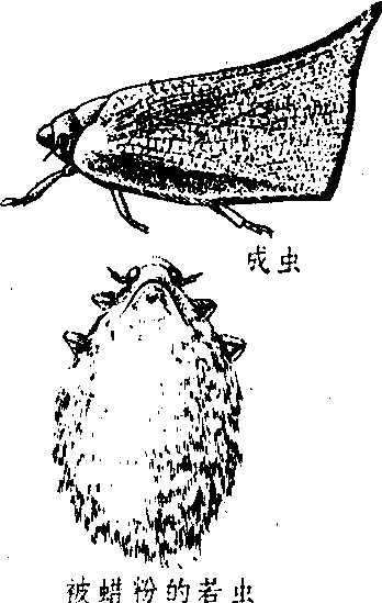 白蛾蜡蝉 中国南方年生2代。第一代成虫于6月上旬初见,7月上旬至9月下旬产卵。第二代成虫9月中旬开始发生,11月上旬多数若虫发育为成虫,但性器官尚未成熟,随着气温逐渐下降,成虫陆续转移到茂密的枝叶上越冬。越冬成虫在2~3月稍暖时开始取食交配,3月上旬至4月下旬产卵。成虫产卵于嫩枝叶柄处,由于成虫产卵期长,田间3月中旬至6月上旬、7月上旬至9月下旬均可见到卵块。初孵若虫群集为害嫩梢,随着龄期增长和植株枝条伸长,若虫逐渐分散,但仍3、4头成群活动,善跳跃。4月下旬至10月下旬在田间均可见到若虫,4、5月和8、9月为若虫盛发期。宜在成虫产卵前、产卵初期或若虫初孵群集未分散期喷洒敌敌畏、马拉硫磷、敌百虫或稻丰散等药液;冬夏剪除有虫枝叶,减少虫源,也可用网捕杀成虫。 白蛾蜡蝉mango cicadaLawana imitata (Meli-char),又称青翅羽衣。昆虫纲,同翅目,蛾蜡蝉科。分布于印度及中国的广东、广西、福建、云南、台湾等省区。寄主有米兰、白兰、无花果、苹婆、蝴蝶果、银桦、龙眼、荔枝、杧果、梅、李、桃等数十种果树林木。成虫体长16~21 mm,黄白色至碧绿色,被白色蜡粉。前胸背板小,中胸背板发达,上有3条纵隆脊。前翅外缘平直,后缘角锐而略长,向上突出。翅面近基部1/4左右处有一较大的白斑。后翅较前翅大,白色或黄白色。末龄若虫体长约8 mm,扁平,体白色,被白色蜡粉,翅芽末端平直,腹末有成束粗长蜡丝。中国一年发生2代,以成虫在茂密枝叶上越冬。卵集中产于嫩枝或叶柄中.呈长方块状。初孵若虫有群集性。成、若虫喜跳跃。以结合冬夏修剪,清除有虫枝叶,减少虫源;喷洒敌敌畏、马拉硫磷、敌百虫等农药为主要防治措施。