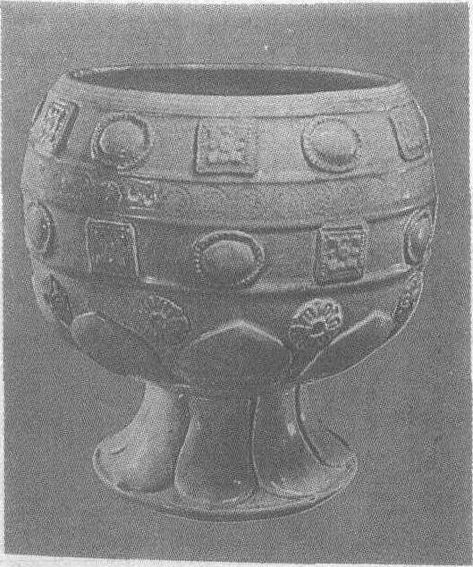 唐。高23厘米,口径18.5厘米。1955年陕西省西安市乾封二年(公元667年)段伯阳墓出土。此钵为唐代白瓷珍品。敛口,圆鼓腹,喇叭形高足。器身装饰以隆起的线条分成三段,其间以模型造花贴饰,第一、三段为圆方相间的宝石样图案,第二段印小梅花一周。钵的下部有宽肥的仰式莲瓣,空隙处饰宝相花,足外壁贴覆状莲。整个器物的纹饰系仿唐代的金银器装饰图案,别致的器形上配上这些精细的花纹,使之成为美观实用的小品。
