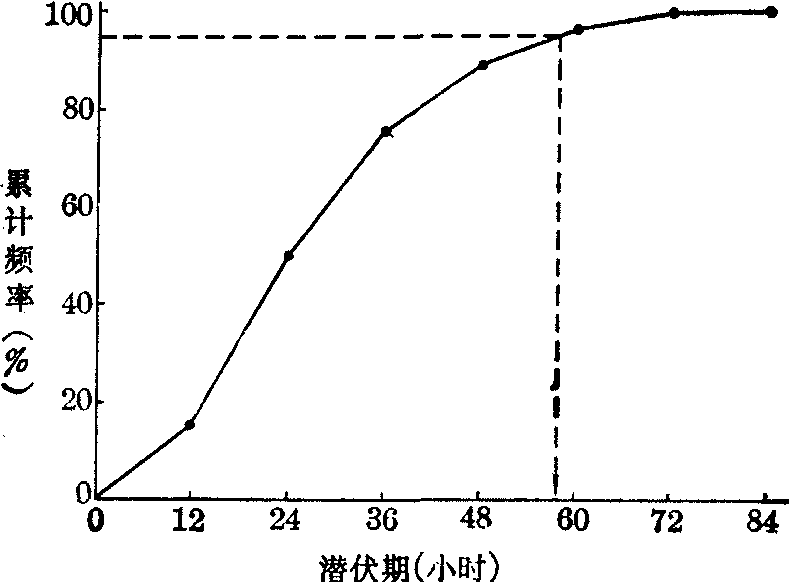 式中fx为n(100-x)%所在组段的频数,i为该组段的组距,U为其上限,∑fU为大于U的各组段的累计频数。同一频数表资料由式(1)或式(2)算得的结果相等,因为式(1)式(2)都是根据补插法原理,两个补插的“点”在理论上应重合。应用时,当Px的x<50时用式(1)较方便,x>50时用式(2)较方便。 图解法 步骤: ❶将观察值编制频数表; ❷求累计频数及累计频率(%)如表第(4)、(5)栏; ❸在方格坐标纸上,以横轴表示频数表的组段,纵轴表示累计频率,依累计频率连成线图; ❹从纵轴上累计频率x%处作一水平线与图中折线相交,过交点作垂线交于横轴,此处的横坐标即所求百分位数 (如图)。图解法用图示代替补插计算,道理相同,但一般不及计算准确。由图可见,特别是靠近线的尾端较平坦部分,准确性较差。如果仅作粗略估计,尤其同时要估计多个百分位数时,用图解法颇方便。 例 某种沙门菌食物中毒患者164例的潜伏期见表第 (1)、(2)栏,求其95%分位数。 潜伏期P95的计算