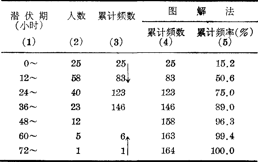 得此次食物中毒潜伏期的第95百分位数为57.8小时。 本例若按式(1)计算,依组段由小到大的方向累计频数,至略小于n(95%)=164×95%=155.8为止,见表第(3)栏上部,代入式(1):