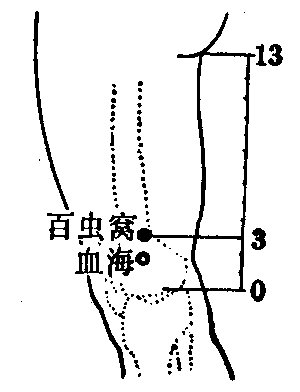 奇穴。首见《神应经》。别名血郄。位于大腿胫侧,髌底内上缘上3寸,亦即足太阴脾经血海穴直上1寸处。屈膝取之。相当于股骨内上髁上方,股内侧肌内侧缘; 有股动、静脉肌支;并有股神经及股神经肌支。一般直刺1~1.5寸。针感局部痠胀或向髋部扩散。艾炷灸3~5壮;艾卷灸5~10分钟。