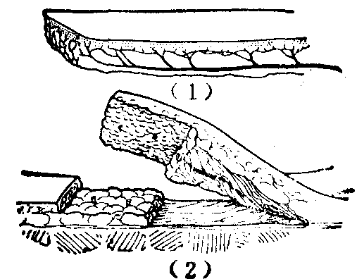 图4 旋转皮瓣 推进皮瓣 为利用缺损外围一侧的局部皮肤所形成的向缺损区作直向推进滑行移转的皮瓣。于皮瓣蒂基部两侧的外方,常各需切除一小块三角形皮肤,以消除所出现的皱褶 (图5)。