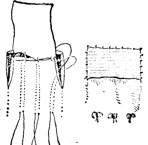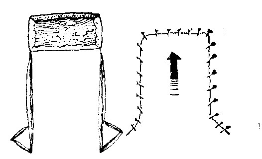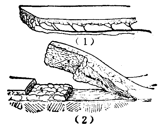 图7 翻转皮瓣 交叉皮瓣 为将供皮区与受皮区互相靠近以进行直接移转的皮瓣。交叉皮瓣属于邻位或远位皮瓣,多用于手、上肢、下肢等部位,如邻指、交臂、交腿皮瓣等(见“指端外伤”、“下肢慢性溃疡”)。交叉皮瓣虽可行直接移转,但均需行肢体制动,所以有时较为不便和痛苦。 袋状皮瓣 是多在腹壁形成的自相折合的皮瓣,供皮区植以皮片,其形如袋,故名。以后用腕部携带进行间接移转,或再将其展平以供修复之需,也或作为既有外被又有衬里的结构,用于洞穿性缺损的修复(图8)。