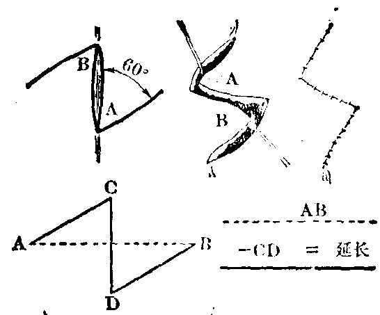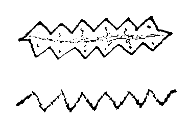 图15 Z成形术原则用于口角错位的复位 W成形术 为除Z成形术外的另一种改变直线方向缝合的手术方法,可认为属于局部推进移转的一串皮瓣。其法,为于切口两侧创缘切成互相交错的锯齿状,于剥离后,使两侧的小三角形皮瓣相向推进拼插镶嵌缝合,如W>字形,故名(图16)。因两侧的皮瓣并不易位移转,故无延长效果。W成形术,可用于缝合针迹显著且瘢痕较宽时的修整。