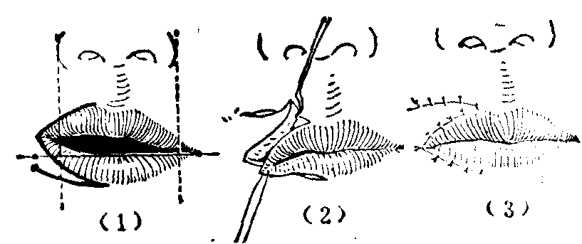 图16 W成形术 V-Y手术和Y-V手术 均属于局部推进皮瓣,前者可用于眼睑、口唇等轻度外翻的复位修复,后者则可用于矫正轻度的内翻(图17)。