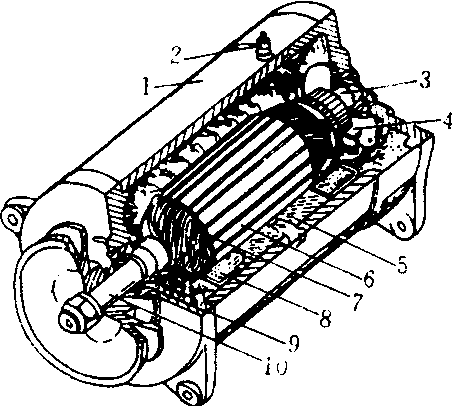 直流发电机构造 1. 外壳 2.接线柱 3.整流子 4. 炭刷 5.磁极铁芯 6.电枢 7. 电枢线圈 8. 激磁线圈 9.軸承 10.电枢轴 直流发电机把机械能变为直流电能的电机。有他激、串激、并激和复激四种。参见“直流电动机”。 直流发电机direct current generator |
