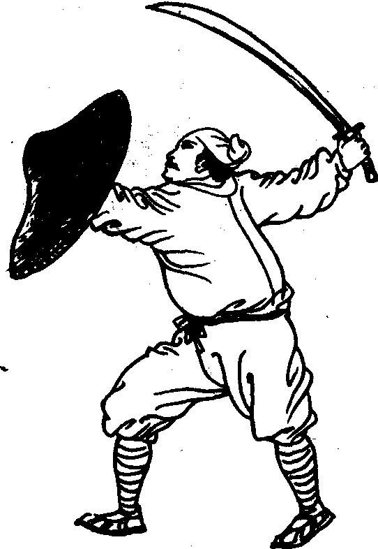 一手持盾牌,一手持刀进行演练。始见于明《三才图绘·人事七卷》一书。动作招势有:跃步势、低平势、金鸡畔头势、埋伏势等。