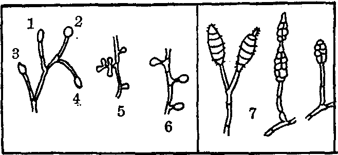 图 1 真菌的两种菌丝 菌丝的隔膜 各类真菌的隔膜构形各不相同,有单孔型隔膜,是子囊菌菌丝的典型隔膜; 多孔型隔膜,如一些丝状酵母菌(Saccharomyces); 复式型或桶状隔膜,如多种担子菌的双核菌丝的隔膜。隔膜孔通常能容许包括核在内的一些细胞器通过。 菌丝的变态 一些专性寄生菌可在菌丝上形成小突起,穿过寄主细胞壁,在细胞内发育成球形、指状或分枝状的吸器吸取养料。某些捕食性真菌常通过其变态菌丝——菌环或菌网来捕食线虫、轮虫等。小煤炱科真菌菌丝可生出1~2个细胞的短枝,称附着枝,使菌丝附着在寄主上。锈菌目真菌的芽管或菌丝顶端膨大,产生附着胞并分泌粘性物,牢固地粘着在寄主表面,附着胞上又生出纤细、针状感染菌丝,再侵入寄主角质层。 菌丝的组织体 交织疏松,还可看出典型菌丝的长形细胞称疏丝组织; 交织紧密,菌丝细胞变成近于圆形或多角形,类似植物的薄壁细胞称拟薄壁组织,两者又统称密丝组织,在很多真菌中形成各种不同营养和繁殖结构。❶菌核。典型颗粒状,大小不一,小如油菜籽的小核菌属的菌核,大到药用的茯苓重2~3千克,是真菌中最大的菌核。菌核坚硬、色深,藏较多养分,抗逆力强,条件适宜时萌发成菌丝体,或在其上产生形成孢子的子实体; ❷子座 由菌丝体形成,也有和部分寄主组织结合而成,为坚硬、形状不一的垫状结构,还有呈团块状或圆槌状,子实体常在子座表面或内层形成,抗逆力强; ❸根状菌索。菌丝纠缠成绳索状,似植物根,作用与菌核相似,常见于引起树木腐朽的担子菌,能侵入机体并蔓延,条件适宜时从先端继续生长延伸,至一定阶段在菌索上可生出伞状繁殖体。 繁殖 真菌能通过菌丝体的断裂短段生长成新菌丝体进行繁殖,但主要是通过一个营养生长期后形成繁殖机构,产生孢子,再萌发产生新的菌体。油壶菌属等低等真菌繁殖时,整个菌体转化成繁殖组织称整体产果式;多数真菌繁殖时,只在部分营养组织上或其中产生繁殖器官和组织,称分体产果式。 无性繁殖 未经性细胞(核)结合,直接在营养体上产生无性孢子,真菌产生多种类型的无性孢子,一种真菌常产生不止一种类型的无性孢子(图2),主要有:❶孢囊孢子。是产生在孢子囊中的内生孢子。在菌丝分枝的顶端或从菌丝特化而来的孢囊梗顶端形成膨大的孢子囊,其中原生质分割成小块,都含有核,通过细胞游离形成过程,生成若干单细胞的孢囊孢子。孢子囊也有在菌丝中间形成。低等水生真菌如鞭毛菌的孢囊孢子无细胞壁,具一或两根鞭毛,能游动,称游动孢子。其孢子囊称游动孢子囊; 陆生的接合菌生成不能游动、有细胞壁的孢囊孢子,称静孢子。 ❷分生孢子。内生或外生,由特化菌丝先端通过一定方式发生,下方的特化菌丝称分生孢子梗,单生、散生或丛生,成束的称孢梗束或束丝。有的分生孢子梗自垫状菌丝生出,使产孢总体结构呈盘状,称分生孢子盘;有的菌丝堆上生出分生孢子梗和分生孢子,称分生孢子座。还有的分生孢子生在覆碗状或球形的分生孢子器中。