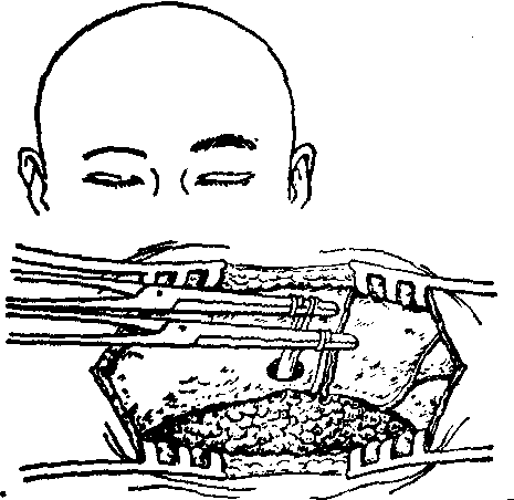 眶上神经切断及抽出术为三叉神经周围支切断术中的一种,适用于疼痛局限于三叉神经第一支范围内的病例。手术方法: 病人仰卧局部麻醉,在病侧眉内作切口,长约2~3cm,骨膜下找到眶上切迹或眶上孔,可见眶上神经由此穿出,局麻后,游离并切断此神经以血管钳夹住其近侧断端,尽量将它从孔中抽出,切除之。然后将眶上神经内侧约0.5~1cm处的额支,近内眦处的滑车上神经,亦按上法分别切断抽出(图)。此手术方法简便安全,对高龄病人尤为适用。但因神经易再生,疗效常不持久,一般仅有数月,少数可达2~3年,现应用较少。