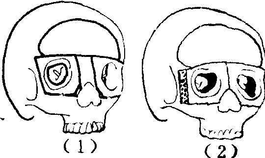 图3 颅下眶骨截骨术 经颅内矫正也有两种方法: ❶ 保留额骨横梁的方法。其原则是先在前额部掀开颅骨瓣,当截开颅骨时,于两侧眶上缘上方保留1 cm宽的横向骨梁。经掀开骨瓣的创口,在硬脑膜外,于眶顶上方至蝶骨翼点和小翼范围内,游离大脑额叶,向内至筛板的两外侧缘。然后在颅面额鼻部行包括颅底、鼻部、筛骨、上颌骨等的截骨术,以取除一中央部骨块。并行眶底、眶外侧壁、眶顶的截骨术,使两眶部完全游离,互向中线推移会聚固定。因有保留的额骨横梁为基准,可以保证内移后两眶部的水平方向和前后位置的对称一致。眶内移后,如引起鼻道堵塞,可将两侧梨状孔边缘作适当凿除。截骨和移位后,所形成的骨缺损裂缝,可用自体骨移植充填(图4)。 ❷保留额骨两侧尖角的方法。偶于有额部脑膨出或先天性骨缺如病例,无法保留额骨横梁时,可改用此法。本法与前一方法的基本原则相同,其不同点为在每侧保留一额骨尖角,用以代替横梁,作为两眶向内移动的基准(图5)。经颅内矫正术适用于畸形严重,和有颅前窝内疾患 (如额或鼻部脑膜膨出或脑膜脑膨出),或筛板位置低于额鼻缝的病例。手术过程中须密切注意防止视神经、动眼神经的损伤。