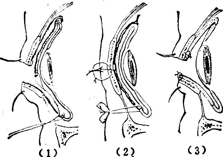 (1)睑球粘连,示形成结膜瘢痕瓣的切口:(2)粘连解除后,以结膜瘢痕瓣修复结膜创面,粘膜游离移植修复球结膜创面。