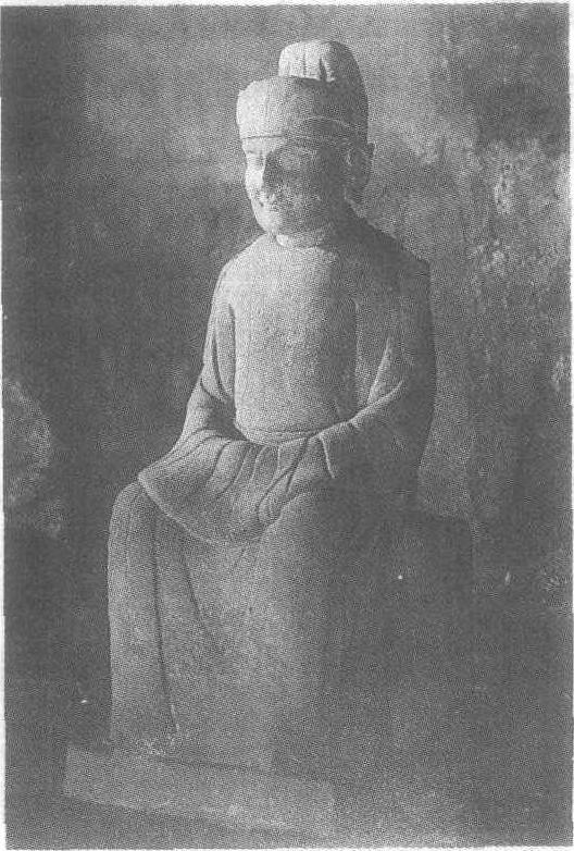 五代前蜀光天元年(公元918年)。通高86厘米。四川省成都市西郊王建永陵石雕像。王建头戴双翅翻束于顶部的幞头,身着圆领长袖大袍,腰系玉带,袖手端坐于石几上。其粗眉深目,隆鼻高颧,薄唇大耳,相貌英俊庄严。本为黑幞、赤袍、肉面的彩妆,因经年历久,色彩已斑驳脱落,只留有残痕。这是目前所知的最早的人物肖像雕刻。王建,(公元847—918年),唐末从杜审权镇压农民起义军,后为壁州(今四川通江)刺史。天复三年(公元903年)被唐封为蜀王,后梁开平元年(公元907年),在成都自立为帝,国号蜀,史称前蜀。