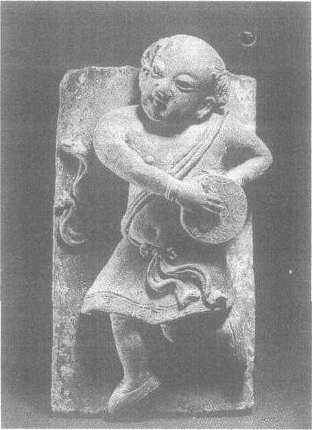 两件作品为砖刻高浮雕,高36厘米。击鼓者,为一头扎双髻的男孩儿,广额大脸,裸上身、着短裙,右手叮咚叮咚拍打着圆鼓,合着铿锵有力的拍节,翩翩起舞。吹笛者,头戴喇叭形笠帽,身穿窄袖束腰长袍,歪头举手作吹笛姿势,露出 一副天真可爱的神气。