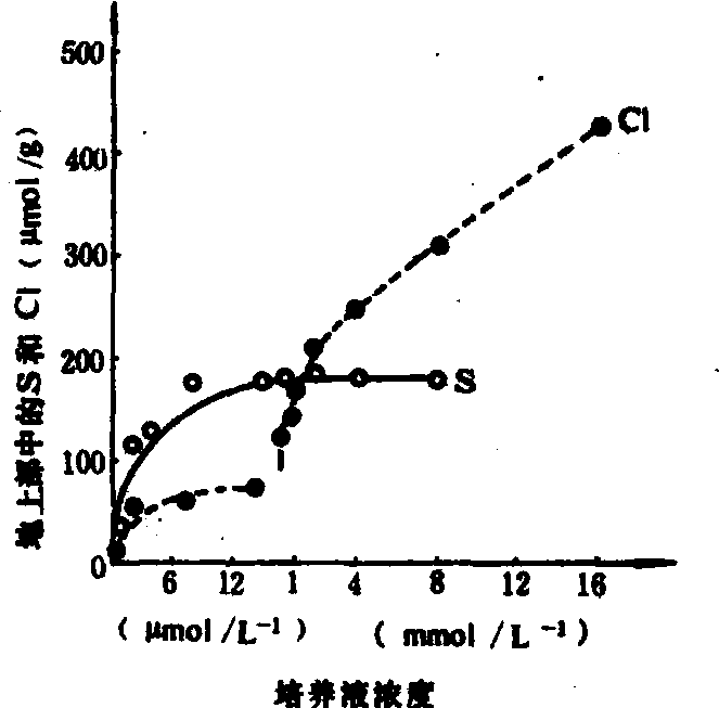 植物主要依靠根部吸收SO2-4 离子。在根部能正常生长的pH范围内,pH对硫的吸收影响不大。其它营养元素一般不影响植物细胞吸收SO2-4,而钼酸盐、铬酸盐、硒酸盐和钨酸盐与SO2-4的化学性质接近,能抑制硫的吸收,表明这些离子可能互相竞争载体的相同点位。 细胞内的SO2-4大部分存在于液胞中。在细胞质中仅有全硫量的1%,液胞中占全硫量的25%。SO2-4通过原生质膜和液胞膜都是主动运转过程。SO2-4在低浓度条件下吸收强,其摄取量约在10微摩尔/升时就达到饱和。在高浓度时,Cl-的吸收大大超过SO2-4吸收;而在低浓度时,SO2-4吸收至少比Cl-吸收高两倍(图)。