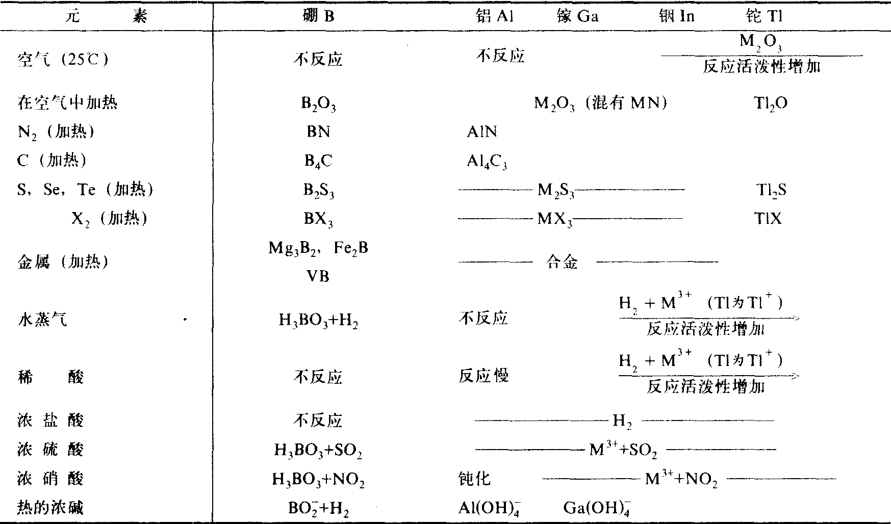 硼是非金属性占优势的元素,其他元素为金属,其金属性随原子序数的增加而增强。硼的氧化物为酸性,铝和镓的氧化物为两性,铟和铊的氧化物则是碱性。硼的化合物完全是共价型的,而其他元素均可形成M3+。硼族元素的原子最外层有3个电子,其构型为ns2np1,为缺电子原子。它们所形成的共价化合物,有时为缺电子化合物,并由于有很强的接受电子对的能力,易形成聚合型分子如Al2Cl6,和配位化合物如HBF4。硼族元素的化学性质见表2。 表2 硼族元素的化学性质 (M为金属元素)