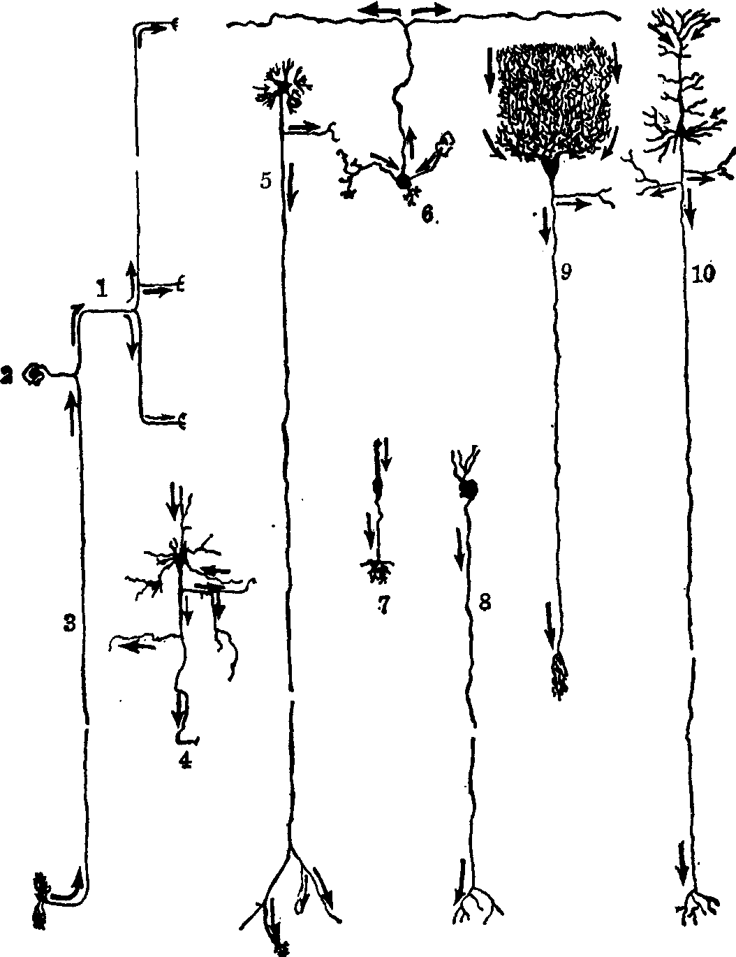 图2 神经元胞体的模式图 轴突起自轴丘,也常起自树突基部。在光镜下,轴丘中无尼氏体。轴突自轴丘起始至髓鞘开始的一段为起始段,动作电位起于此部。轴突的侧支以直角发出,末梢分支多呈终纽样,与其它神经元形成突触。轴浆内含有除胞体中尼氏体和高尔基复合体以外的一些细胞器。胞体中合成的蛋白质物质沿轴浆流向末梢称为轴浆流,是顺行的,含神经递质的囊泡传递较快,维持轴突生存和生长的蛋白质等传递较慢。逆行流动也存在,某些物质可自神经末梢传至胞体,称为逆轴突传递。 ☚ 神经系 突触 ☛ 神经元 神经元neuron亦称“神经细胞”。神经系统的基本结构、功能单位。结构分为细胞体和突起两部分。细胞体由细胞膜、细胞质和细胞核组成。突起分成树突和轴突,是细胞质的丝状延伸物。轴突较长而分支少,外有或无髓鞘,构成神经纤维;树突较短而分支很多,形成树状,存在于中枢神经系统和神经节内,通过细胞突起,与其他神经元或效应器官相接触。功能为接收、储存和传递信息。按照结构分为单极神经元、双极神经元和多极神经元;按照功能分为感觉神经元、中间神经元和运动神经元。 ☚ 梯状神经系统 树突 ☛ 神经元 神经元亦称“神经细胞”。神经系统的基本结构、功能单位。结构分为细胞体和突起两部分。细胞体由细胞膜、细胞质和细胞核组成。突起分成树突和轴突,是细胞质的丝状延伸物。轴突较长而分支少,外有或无髓鞘,构成神经纤维;树突较短而分支很多,形成树状,存在于中枢神经系统和神经节内,通过细胞突起,与其他神经元或效应器官相接触。功能为接受、储存和传递信息。种类按照结构分为单极神经元、双极神经元和多极神经元;按照功能分为感觉神经元、中枢神经元和运动神经元。 ☚ 神经 神经系统 ☛ |