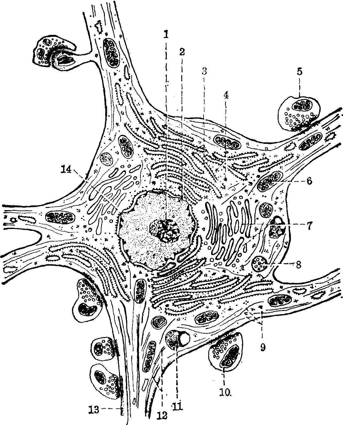 图1 几种神经元的形态(箭头表示冲动传导的方向) 神经元胞体(图2),细胞膜的结构与其它细胞相似,可调节细胞内和环境之间物质和离子交换,还具有其特殊功能,即参与冲动的接受和传递。细胞核较大,一般与胞体大小成比例,直径约3~18μm,居正中位,例外的是脊髓胸核中的细胞核是偏心位的。在自主神经节中有含两个细胞核的神经元。由于DNA呈微粒均匀散布于核质内,在光镜下着色浅淡。双层的核膜间断地为核孔洞穿。大而清晰的核仁特别关系着胞体中核酸和蛋白质的产生。在雌性动物靠近核仁处有性染色小体,称为核仁卫星或Barr体,呈无界膜的致密颗粒状。尼氏体和神经原纤维是神经元胞质中两个突出结构。嗜碱性的尼氏体分布于胞体和树突中,不见于轴浆内;在不同的神经元中虽可呈块状或粒状,在电镜下都成自粗面内质网和游离的多聚核蛋白体,是胞体的蛋白质合成器,其功能是经常恒定地补充正常生理活动中的消耗。当轴突在距离胞体