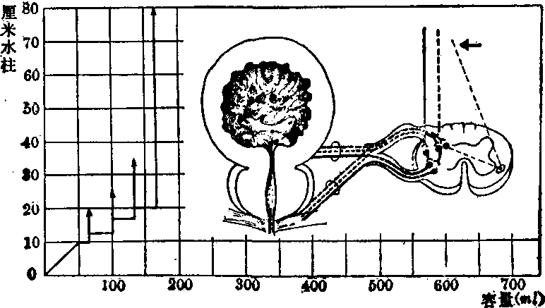 图2 弛张型神经性膀胱 ←: 损害部位,于脊髓反射中枢及以下膀胱测压: 内压低 诊断应首先确定病因。尿动力学检查可了解其类型,检查项目包括膀胱测压、逼尿肌压力、尿流率、尿道压力描图和括约肌肌电图。尚需测定残余尿量,作膀胱尿道造影及膀胱镜检查。 于原发病治愈后,若排尿功能不恢复,可按下列原则治疗,以减少残余尿,预防尿路感染,保护肾脏免受损害。治疗方法如下: 痉挛型: ❶膀胱容量较大者,训练定期排尿。 ❷应用副交感神经阻滞剂如溴本辛、丙咪嗪或双环胺,增加膀胱容量。 ❸膀胱容量小并有输尿管反流者,作骶神经阻滞,阴部神经切除或选择性(骶-3) 神经切除术。 ❹定期导尿。 ❺佩带集尿袋,适用于尿频严重的男孩,以及因残余尿多而施行经尿道膀胱颈切除或外括约肌切开术后的尿失禁者。 弛张型: ❶定期按压下腹部排尿,若失败则定期导尿。 ❷针灸治疗。 ❸使用增强逼尿肌收缩力的拟副交感神经药物,如氨甲酰甲基胆素,也可用苯苄胺将支配膀胱颈和尿道平滑肌的交感神经阻滞,帮助膀胱排空。 ❹电刺激:将电极植入膀胱壁或骶管内,供体外电刺激器的感应,使逼尿肌有效地收缩;可植入的人工括约肌也已设计成功。 ❺膀胱出口阻力增加而药物治疗无效者,可采用尿道扩张术,经尿道膀胱颈切除术或外括约肌切开术,并佩带集尿袋。 神经性膀胱并发泌尿系感染,上尿路逐渐扩张及尿失禁无法控制,应施行尿流改道手术。 ☚ 膀胱外翻 膀胱肿瘤 ☛ |