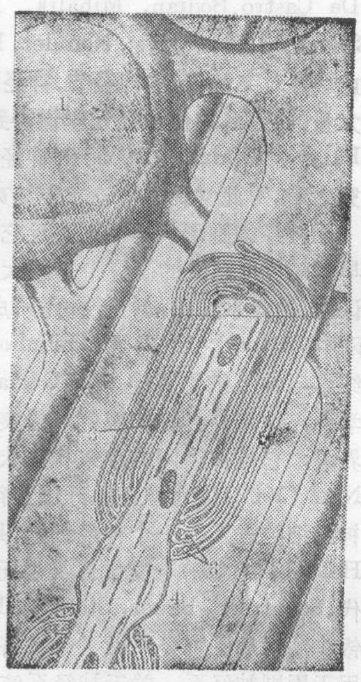 图1 周围有髓神经纤维超微结构模式图 A光镜下有髓纤维纵切面。黑色部分示髓鞘,中央白色部分示轴突,V形裂缝示Schmidt-Lantermann裂隙 B.为A图左侧方格的电镜图,示Ranvier结的纵切面 C.为A图右侧方格的电镜图,示Schmidt-Lantermann 裂隙的纵切面 D.Ranvier结横切面电镜图 E.结间体横切面电镜图,髓鞘板层只绘几层示意 F.结旁区横切面电镜图 1.轴突 2.膜内致密层 3.指状突起 4.致密突起5.胞质囊 6.主致密线 7.周期内线 8.基板 9.外层胞质 10.内层胞质 11. Schmidt-Lantermann裂隙 12.间隙物质 13.外轴系膜 14.内轴系膜 15.胞质柱 髓鞘是Schwann细胞的胞膜内折所成的轴系膜紧密卷绕轴突所成(图2)。每个Schwann细胞形成一个结间体。电镜下,成熟的髓鞘是多层呈同心圆规律配布的板层结构(图2,D,E)。板层的重复单位厚17~18.5nm,相当两层细胞膜。暗板层着色深,厚3.5nm,是两层细胞膜的胞质面并合所成,称主致密线。主致密线间为着色浅的明板层。此层中有较深而不很清楚的周期内线,厚约2nm,是两层细胞膜的外表面并合所成(图2)。主致密线和周期内线大概代表细胞膜的蛋白质,明板层代表细胞膜中的脂类。Schmidt-Lantermann裂隙为螺旋状卷绕的板层局部分离的区域(图1)。此区的板层沿主致密线分开,其间有细胞质存在。Schwann细胞的胞质大部分存留在髓鞘的外侧和内侧,且以外侧较多。轴突周围有宽10~15nm的间隙,称轴周间隙。髓鞘外面和内面的板层各与外、内轴系膜相连。外和内轴系膜于靠近细胞表面处分开,与Sch-wann细胞的膜相连(图2)。结间体末端称结旁区。此区髓鞘外侧胞质多,聚成纵向的胞质柱(图1)。胞质柱向Ran-vier结伸出多个指状突起(图1,F)。结两侧的指状突起互相嵌合,末端贴附轴膜,故Ranvier结处轴突并不真正裸露。结旁区髓鞘板层依次分离,含胞质多,在神经纤维纵切面上呈舌状囊(图1)。这些胞质囊紧贴轴膜,两者之间有细短的致密突起相连(图1)。Ranvier结的这些微细结构大概与轴膜内、外离子迅速交换有关,但其细节还不了解。Ranvier结处轴突含线粒体较多,轴膜内面有与轴突起始段相似的膜内致密层。有髓纤维传导神经冲动的速度比无髓纤维快。传导速度与轴突直径,尤其与髓鞘厚度和结间体长度成正比。因髓鞘富有脂类,有绝缘作用。Ranvier结和轴周间隙可供轴膜内外交换离子。有髓纤维传导神经冲动,是由一个Ranvier结到另一个结的跳跃式传导。