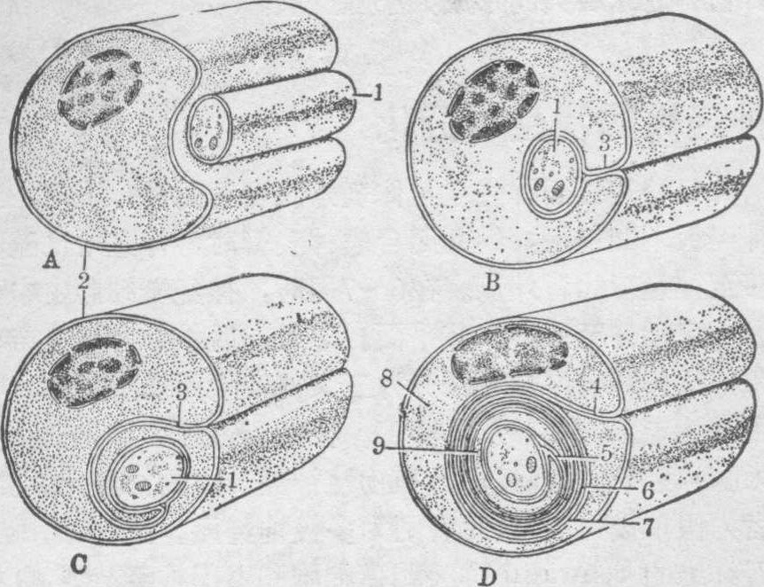 图1 周围神经纤维髓鞘的发生 1.轴突 2. Schwann细胞 3.轴突系膜 4.外轴突系膜 5.内轴突系膜 6.主致密线 7.周期内线 8.外层胞质 9.内层胞质 周围神经纤维髓鞘的发生 周围神经的髓鞘是由Schwann细胞缠绕轴突形成的。神经嵴迁移来的Schwann细胞先成串地附着在轴突上。每一Schwann细胞与轴突相贴处均凹陷成一纵沟,轴突乃陷入此纵沟内(图1,A),沟缘两侧的细胞膜互相合并形成轴突系膜 (图1,B)。这样,轴突便完全被Schwann细胞包裹。随后,轴突系膜变长,并绕轴突包卷许多周(图1,C、D)。原在轴突系膜间的胞质被挤至细胞的内、外表面和上、下缘,以致各层系膜的胞质面互相合并,构成较粗的主致密线; 而系膜内,即两层胞膜外表面合并处则形成较细的周期内线,或称周期间线(图1,D)。因此,系膜包卷轴突的结果乃形成粗线(主致密线)和细线(周期内线)相间排列的螺旋板层结构,这就是髓鞘。故髓鞘是Schwann细胞的双层胞膜(即系膜)绕卷轴突层叠形成,每一Schwann细胞所形成的髓鞘节段称为结间体,相邻结间体之间无髓鞘包裹轴突的缩窄部位称Ranvier结(图2)。Schwann细胞的表层胞质也在靠近Ranvier结处增多,并向Ranvier结区伸出许多指样突起,与相邻Schwann细胞的指样突起嵌合,覆盖Ranvier结区 (图2)。Schwann细胞外面附有基膜,此基膜形成连续的一层,包裹有髓神经纤维外面,称神经膜管。