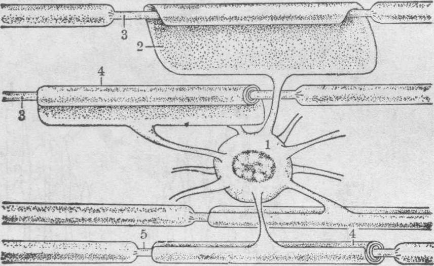图2 周围有髓神经纤维立体图解 1.Schwann细胞胞核 2.Schwann细胞胞质 3.轴突(内含微管及神经丝) 4.髓鞘 5.外轴突系膜6.Ranvier结 7.Schw-ann细胞的指样突起 8.基膜(神经膜管) 中枢神经纤维髓鞘的发生 中枢神经系统有髓纤维的髓鞘由少突胶质细胞形成。少突胶质细胞突起末端扩展呈扁平薄膜绕卷轴突许多周(图3),薄膜内的胞质被挤至边缘。因此,除边缘处含有胞质外,其余均无胞质,胞膜的胞质面互相贴合形成较粗的主致密线,胞膜外表面贴合形成较细的周期内线,这和周围神经纤维髓鞘发生一样,形成了粗、细线相间排列的髓鞘板层。髓鞘板层两端亦因含胞质而形成胞质囊(即胞质索)贴附在轴膜上,但与周围神经纤维髓鞘的发生有下列不同点: ❶一个少突胶质细胞可藉其伸出的多个突起,形成不止一条神经纤维的髓鞘结间体,少突胶质细胞含核的细胞体位于神经纤维之间; ❷髓鞘内、外表面的胞质很少,结间体内也无Schmidt-Lantermann切迹; ❸Ranvier结区无指样突起覆盖; ❹神经纤维外面无基膜,即无神经膜管的形成。