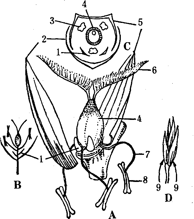☚ 单子叶植物纲 百合科 ☛ 禾本科 禾本科Hebenke被子植物门。单子叶植物纲的一个科。被子植物五大科之一,约600属,6 000种以上,广泛分布于全世界。我国193属,约1 200种。通常为草本,除竹类以外称禾草,只竹类为木本。茎特称为秆,圆形,有明显的节和节间,节间通常中空(玉米、高粱、甘蔗实心)。叶二列互生,分叶片、叶舌和叶鞘三部分,有时具叶耳(如大麦),叶脉平行。小穗是构成花序的基本单位,由小穗再集成总状、穗状、伞房或圆锥花序。每小穗由小穗轴、2个颖片和1至多朵小花组成。小花由外稃1片、内稃1片、鳞被(浆片)2片,雄蕊3枚和1枚2个合生心皮雌蕊组成,具2条羽毛状柱头,子房1室,内含1胚珠。颖果,果皮与种皮结合,极少为胞果、坚果或浆果;种子胚小,胚乳丰富。本科通常分为2个亚科,即竹亚科和禾亚科。竹亚科:为木本,叶片具短柄,花具3片鳞被和6枚雄蕊,是本科中较为原始类型。禾亚科:为草本,叶片无柄,2枚鳞被和3枚雄蕊。是本科较进化类型,种类最多,经济意义最大。现在对禾本科有人分成3亚科,5亚科或6亚科。本科经济意义重大,有多种为重要粮食作物,如水稻、小麦、玉米、高粱、大麦、黑麦、裸麦、莜麦、谷、黍稷等。甘蔗是重要糖料。雀麦、鸭茅、梯牧草、鹅观草、羊草、冰草、披碱草等多种为重要牧草。香茅和枫茅可提取芳香油。薏苡又称药玉米籽粒可食用又可入药、酿酒。野牛草、狗牙根、早熟禾、剪股颖等多种可作草皮。 ☚ 单子叶植物纲 小麦 ☛ |