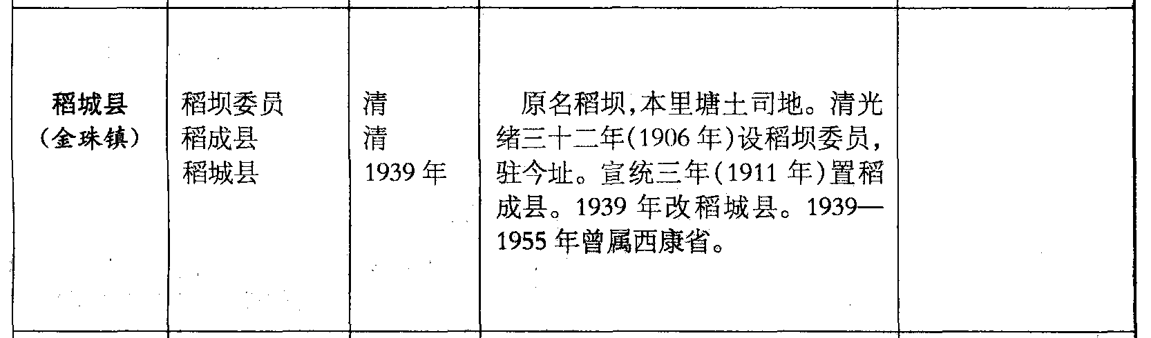 稻城县(金珠镇)稻坝委员稻成县稻城县清清1939年原名稻坝,本里塘土司地。清光绪三十二年(1906年)设稻坝委员,驻今址。宣统三年(1911年)置稻成县。1939年改稻城县。1939—1955年曾属西康省。