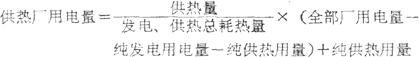 式中: 发电、供热总耗热量=各汽轮机进汽的含热量-锅炉给水含热量+自锅炉经减压减温器及直接对用户的供热量 全部厂用电量=发电厂的全部用电量-不计入厂用电量 纯发电用电量指循环水泵、凝结水泵和他励磁用电量;纯供热用电量指热网水泵、供热蒸发站等用电量。 |