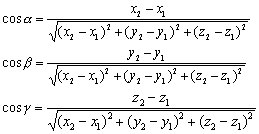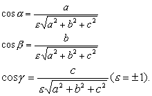 任一射线的三个方向余弦的平方和必等于1,即cos2α+cos2β+cos2γ=1.反之,如果一个三元实数组中三个数的平方和等于1,则它们必可以作为一条射线的方向余弦. 如果一条射线的方向余弦是λ,μ,γ,则与λ,μ,γ成比例的三个数a,b,c叫做这条射线所在直线的一组方向数. 这个关系可用下面三个形式中的一个来表示:a:b:c=λ:μ:γ,或a/λ=b/μ=c/γ,或aα=kλ,b=kγ,c=kγ (k≠0). 设有一点P(x,y,z),则P点的坐标x,y,2就是直线OP的一组方向数. 设有两点P1(x1,y1,z1)和P2 (x2,y2,z2),则x2-x1 ,y2-y1,z2-z1就是直线P1P2的一组方向数.如果三个不都是零的数a,b,c是一条直线的一组方向数,则它可以决定两组方向余弦: