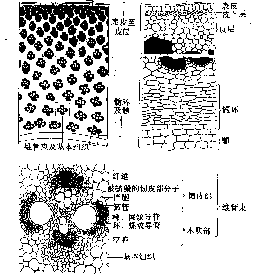 毛竹竹秆横断面图 表皮层 竹壁最外的一层细胞,由长形细胞、栓质细胞、硅质细胞及气孔器构成。长形细胞数量最多,呈长方柱形,纵行排列整齐。栓质细胞和硅质细胞形状短小,常成对结合,散生于长形细胞行列之中。每平方毫米竹秆表皮上有数个至十几个气孔。 皮下层 由一至二层小形柱状细胞构成,胞壁较厚。丛生竹皮下层胞壁较薄,和皮层细胞无明显区别。 皮层 由数层至十几层细胞构成,比皮下层细胞稍大。皮层宽窄因竹种及竹秆部位不同而有差异。大秆竹种皮层细胞列数多于小秆竹种。同一竹种竹秆,基部皮层细胞列数多于梢部。如毛竹竹秆基部皮层细胞为10~12列,中部为5~6列,上部为2~3列。幼嫩竹杆皮层细胞含叶绿体,故秆面呈绿色。 基本组织 为一些多角形薄壁细胞,胞壁随竹秆年龄增大而逐渐加厚,具单纹孔。细胞大小不一,一般长度50~300微米,直径30~60微米。 维管束 散生于基本组织中,其大小和密度与竹秆部位、竹秆粗度及竹种有关。维管束横断面积一般为0.1~0.5平方毫米,每平方毫米竹材约有5~7个维管束。同一竹秆自下而上、自内而外,维管束横断面积逐渐减小,密度逐渐增大。同一竹种秆粗的维管束密度比秆细的小。维管束由韧皮部、木质部及其四周的纤维群所构成。韧皮中有筛管、伴胞及小形薄壁细胞。木质部有木质化的导管及木薄壁细胞。导管为环纹、螺纹、网纹或梯纹型,一般长度300~1 200微米,直径15~200微米。纤维的大小和含量与竹秆部位和竹种有关。多数竹种纤维长2.1~2.7毫米,宽14~19微米,长宽比为119~172。竹秆纤维,在竹秆中段最长最粗,下段次之,上段最短最细;在竹壁中部最长最粗,内部次之,外部最短最细。纤维的长宽比,在竹秆上段最大,向下逐渐减小;在竹壁外部最大,向内逐渐减小。 髓环(竹黄主要成分) 为数层及十数层横向整齐排列的砖形细胞。胞壁木化增厚或较薄,与髓细胞无明显区别(如孝顺竹、御江箬竹)。 髓 为一些大形薄壁细胞,一般成膜状(竹衣、笛膜),有的成片状(如短穗竹)或海绵状(如矢竹、绿竹)。髓破坏后留下的空隙即竹秆中空部分称为髓腔。 不同竹种竹材上述各种组织的组成比例不同,33种竹种竹材的平均值为:纤维40.8%,导管6.1%,筛管及薄壁组织52.8%。散生竹与丛生竹在竹材构造上,有明显的区别。散生竹竹材的皮下层和皮层细胞的形状差异显著,基本组织细胞较粗而长,维管束中的纤维群没有被薄壁组织分隔的现象,原生木质部多为薄壁组织所填充。丛生竹竹材的皮下层和皮层细胞无显著区别,基本组织细胞短而细,维管束纤维群常有被薄壁组织分隔的现象,原生木质部皆成空腔,没有填充物。 竹材超微构造 一般光学显微镜不能观察到的竹材细胞壁的精细结构。只有借助电子显微镜和X射线衍射分析等方法才能对它进行观察研究。竹材细胞壁的主要成分为纤维素、半纤维素(杂多糖)和木质素。这三种物质紧密相连存在于一个系统中,纤维素是骨架,木质素是结壳物,半纤维素是连接纤维素与木质素的物质。竹材细胞壁中的纤维素,它的基本组成是一些长短不等的链状纤维素分子,这些分子链有规则地聚集在一起称为微团,由微团组成为一种丝状微团系统,即微纤丝,进而聚集成不同等级的纤丝。由纤丝组成了细胞壁层。目前只能观察到微纤丝的排列情况。竹秆各种细胞超微结构的共同特征是初生壁上微纤丝排列稀疏,交错成网状,此层很薄,相邻两细胞的初生壁与胞间层紧密相连成复合胞间层。次生壁呈宽窄交替的多层结构,宽层中微纤丝排列与细胞轴向近于平行,而窄层中微纤丝的排列近于垂直。各种细胞的特征如下: 纤维 存在于维管束鞘中,其细胞壁呈现宽窄交替的多层厚壁状,紧连初生壁的第一层次生壁其微纤丝走向与细胞轴成50°,从外层向内层各宽层中微纤丝排列由陡向斜,大致从2°~5°到10°~20°;与此相反,各窄层中微纤丝排列几乎是平行的,与细胞轴约成85°~90°。不存在典型的三生壁。某些竹种细胞内壁上有瘤层。在纵向壁上纹孔稀少,纹孔膜呈交错的网状结构。 薄壁细胞 围绕维管束的基本组织,由垂直伸长和近似正方体的两种薄壁细胞所组成。长薄壁细胞的次生壁具有宽窄交替的多层结构,层数多至15个。宽层(约0.2微米)微纤丝排列略呈弓形,埋于窄层(约0.04微米)中而呈鱼骨状。短的薄壁细胞为非木质化细胞。两种薄壁细胞均有瘤层。 导管分子 它们的次生壁由两个不同部分的环状组成:一个宽约0.2微米,微纤丝排列成平螺旋状,与细胞轴约成90°~95°;另一个宽约2.2微米,微纤丝排列成30°~90°。部分竹种有瘤层。细胞纵向壁上有大量的具缘纹孔,纹孔膜结构均匀,微纤丝排列成交错的网状结构。 筛管分子 筛管上的微纤丝围绕着细胞中心平行排列,且垂直于细胞轴。 纤维细胞壁的多层结构与木质化的多层薄壁细胞壁的结合,使竹秆具有很高的抗拉与抗弯强度。宽窄层微纤丝的交替排列对消除各向异性有利。 见木材构造、木材细胞壁构造。 |