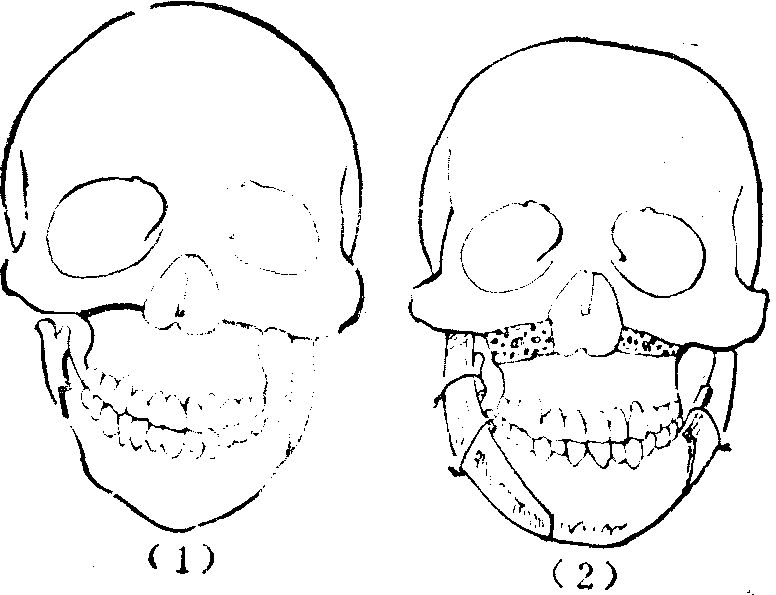 图1 右第一、二鳃裂综合征 整形手术治疗,如为骨胳的轻度畸形,行上颌骨、颧骨、下颌骨体部的外嵌植骨术后,即可获得较好的形态。移植骨可取自髂骨或肋骨,劈分后应用。骨骼的重度畸形,则需长、宽、厚的立体修复。因外嵌植骨法只能增加宽度和厚度,故还需在植骨前先行长度的延长,即上颌骨的横向截骨和下颌骨升支的纵向劈分截骨术,然后以健侧的上颌结节为轴向正常侧旋转, 使咬面恢复水平位。 旋转后,在上颌骨所出现的楔状缺损以骨块移植充填,下颌骨的空隙则以移植骨桥接,并可增加下颌部宽度; 下颌骨升支关节端缺失者,也可用移植骨替代修复(图2)。日后还需行下颌骨的颏部截骨并向前方和健侧推进的颏成形术,或恢复颞下颌关节活动的手术。