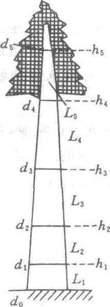 等直径差区分求积法height accumulation method又称累高法。内业计算立木材积实测方法。该法是按照树干递减直径的等差级数对树干进行区分(如图),即要求各区分段大头直径与小头直径的差值相等(直径差值可取2、3、4 cm等),并测得不等长区分段的长度,梢头材积忽略不计。其计算树干材积式为:  式中h′i为自树干下部向上第i区分段小头以下各区分段依次累加高度(hi)的再次逐段累计值(累计高);li为第i区分段的长度;A为 ;c为 (T为直径差,K为树干形状系数,一般取K=3)。在森林调查中,被抽中的3P样木,用累高法实测其立木材积,可以消除利用材积表所带来的误差。