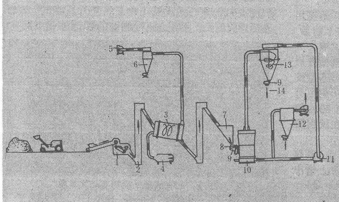 1.锤磨;2.斗式提升机;3.干燥机;4.空气加热器;5.排风机;6.旋风分离器;7.干燥物料缓冲贮料斗;8.磨进料器;9.气闸; 10.闭路环辊研磨机; 11.空气循环风扇;12.排气过滤器及风扇; 13.旋风收集器; 14.产品