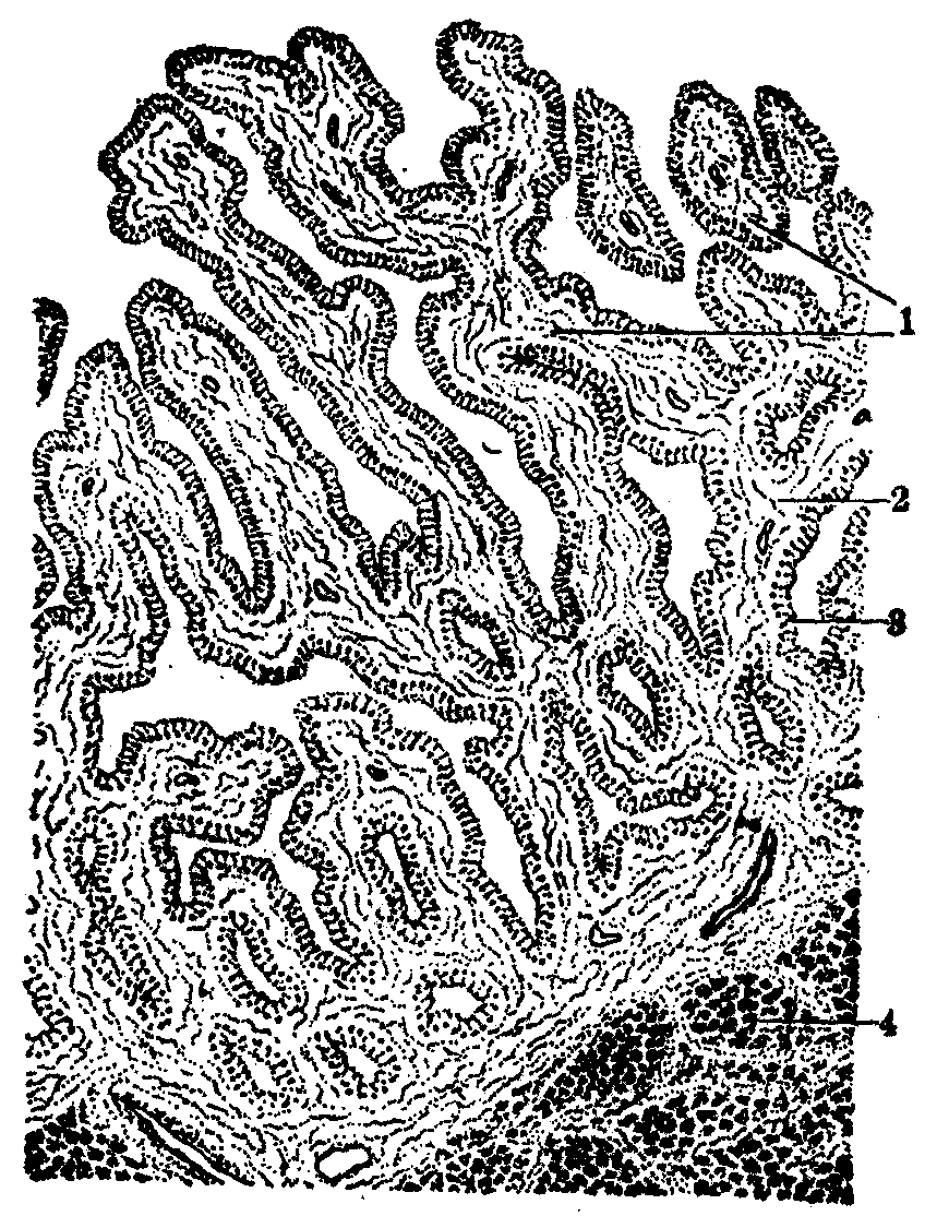 精囊腺光镜模式图 1.粘膜皱襞 2.固有层 3.上皮 4.肌层 ☚ 前列腺 尿道球腺 ☛ |