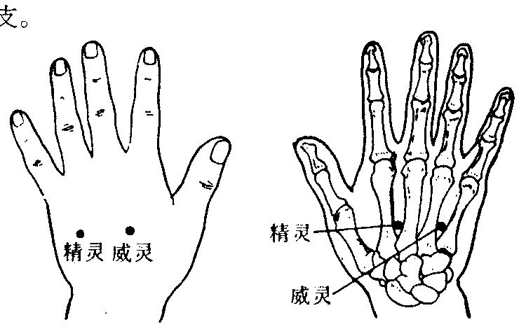 奇穴。首见《小儿推拿方脉活婴秘旨全书》。包括精灵和威灵二穴。别名腰痛点。位于手背部: 精灵,在手背第四、五掌骨间中点,第四指伸肌腱尺侧凹陷处;威灵,在第二、三掌骨间的中点,第二指伸肌腱桡侧凹陷处。均俯掌取之。精灵穴在第四骨间背侧肌中;有手背静脉网,掌背动脉分支; 并有尺神经手背支。威灵穴在第二骨间背侧肌中;有手背静脉网,掌背动脉分支,并有桡神经手背支。