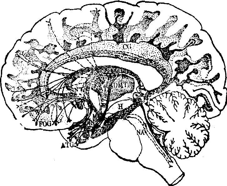 研究边缘系统与前脑的解剖生理也取得了很大的进展。这对精神外科的原理提供了重要的根据。Papez(1937)描述了一条往返于下丘脑、丘脑前核、扣带回及海马之间的纤维环路,认为它可能是情绪、感觉与行为的中枢。Yakovlev (1948)在Papez的基础上又补充了一条来回于额眶叶、脑岛、颞前皮质、杏仁核及丘脑背内侧核之间的纤维环路,亦参与情绪与行为活动。这些纤维大体上排列成同心圆的形式,其中心区主管内脏活动,中间层主管情绪活动,最外层为实现对周围环境改变的活动。MacLean (1949)把中间层列为内脏活动与情绪之间相互作用最强的一层,并认为与精神躯体疾病的发生有重大的作用,于1952年将这环路定名为边缘系统。目前已公认边缘系统包括Papez环路即内侧环路及Yakovlev环路即基底外侧环路两个组成部分,它们都接受来自中枢不同水平的控制,调节着情绪与行为活动,使之处于稳定状态。如调节功能发生故障便引起各种不同程度的情绪或行为改变。来自海马的紊乱与来自杏仁核的紊乱都可引起不同的情绪与行为紊乱。边缘内侧环路与中脑的网状结构有较多的联系,其传递物质为乙醯胆碱,这使得海马也参与在上升激活(觉醒)系统之内,具有注意、记忆及学习的功能。这一环路的破坏将引起运动与精神活动减低的精神状态,如不动不语、淡漠、睁眼昏迷等综合征。这里的刺激性病变将引起动作及精神活动过多的综合征,如焦虑、兴奋激动、强迫观念及强迫行为等一类的精神状态。正与临床经验一致在内侧环路制造破坏性病损有助于缓解活动过多综合征。