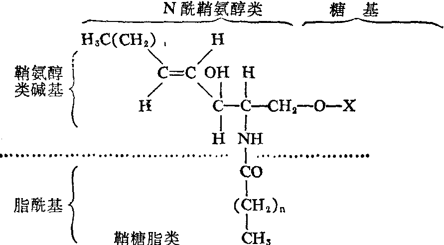 从上列通式不难看出,鞘氨醇类碱基及酯酰基具有疏水性,而糖基呈亲水性,因此在整个鞘糖脂分子内部形成疏水和亲水两个部分。这与鞘糖脂类的细胞分布和生物学作用有密切关系。 (1) 鞘氨醇类及N-酰鞘氨醇类:存在于自然界中的鞘氨醇类,其碳链长度固有不同,但是绝大多数由十八碳组成,分子中除含氨基、伯醇基各一个外,最少还必须有一个仲醇基。 由于长链上的第2、 第3位碳原子不对称,理应存在四种空间异构物,可是目前在动物组织中所发现的全属D—(+)—赤藓型。又在4、5位碳间常具有双键,而天然存在的一般总是反型的。分布于动物体的鞘氨醇类主要是鞘氨醇,植物的主要是二氢鞘氨醇、植物鞘氨醇以及8-脱氢-4-羟二氢鞘氨醇等。但是近年在动物肾脏也发现有少量植物鞘氨醇存在。几种常见鞘氨醇类的化学结构如下: