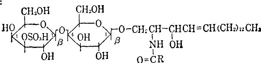 8-脱氢植物鞘氨醇(8-脱氢-4-羟鞘烷氨醇) 鞘氨醇类借其氨基与脂酰基相结合的酰胺化合物称N-酰鞘氨醇(神经酰胺)类。鞘糖脂类和鞘酯类化合物全可以看做是N-酰鞘氨醇类的衍生物。 存在于动物组织的N-酰鞘氨类分子中的脂酰基通常是由十六及十八碳组成,而最常见的又是硬脂酰基。但是人类脑中鞘糖脂常含有较多的廿四碳酰基,故曾以其所含廿四碳酰基来命名鞘糖脂(表1)。然而随着分子中糖基数的增加,糖脂的亲水性逐渐增大,在一些含寡糖基的糖脂中,即使酰基有一定差别,也不会影响整个分子的性质。 表1 脑中鞘糖脂的名称及其酰基组成 表2 部分糖基N酰鞘氨醇和硫脂的名称及结构