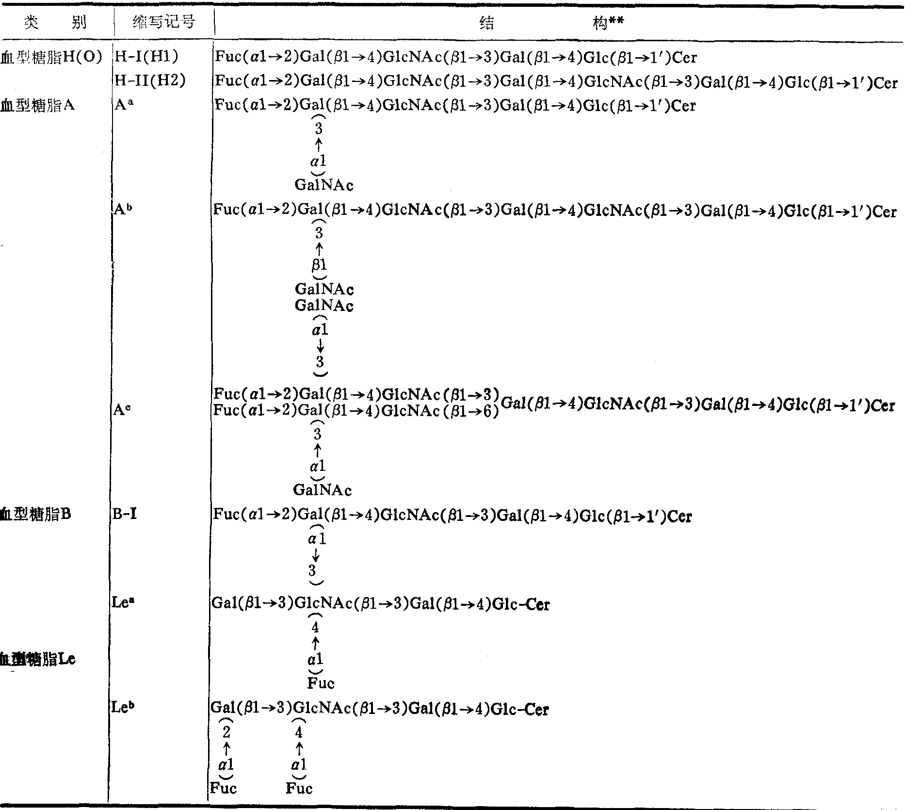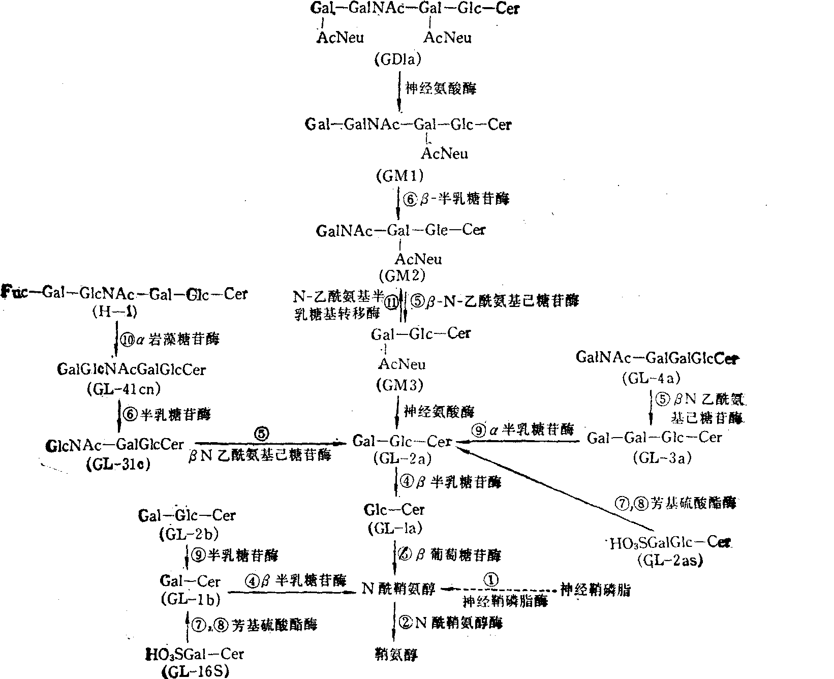 * Cer: N酰鞘氨醇基; Glc:葡萄糖基;Gal:半乳糖基; GlcNAc: N酰氨基葡萄糖基; GalNAc:N-酰氨基半乳糖基; α或β糖苷的空间配位; 1′,1,2,3,4: 结合位置。例如HO3S3Gal(β1→4)Glc (β1→1′)Cer表示 **均具有半乳糖与N酰鞘氨醇直接相连结的结构特点,故有人把它们统称为半乳糖脂(2) 糖: 鞘糖脂分子中的糖基可以是单糖、双糖、叁糖,直至寡糖,而且组成这些糖基的单位主要是己糖和N-乙酰氨基己糖。海鸟类的木糖脂虽含有木糖,但在其他动物尚无发现。酸性糖脂的神经节苷脂分子中还含有酸性较强的N-乙酰神经氨酸(又称唾液酸)或N-羟乙酰神经氨酸,前者存在于一切动物,后者仅发现于人和鸡以外的动物。单糖的结构见“糖类”条。 (3) 鞘糖脂类的糖链结构与分类: 随着新的鞘糖脂的不断发现,给鞘糖脂类的命名和分类带来很多困难。目前比较普遍应用的一种分类是先按分子组成,将鞘糖脂分为三组: ❶只含己糖基及N-乙酰氨基己糖基的鞘糖脂称为中性鞘糖脂; ❷含N-乙酰神经氨酸基或N-羟乙酰神经氨酸基的鞘糖脂称酸性鞘糖脂或神经节苷脂; ❸带硫酸基的称硫脂。中性鞘糖脂还可根据糖基中单位糖基数的多少,再分成单糖基N-酰鞘氨醇(GL-1),二糖基N-酰鞘氨醇(GL-2),三糖基鞘氨醇(GL-3),四糖基N-酰鞘氨醇(GL-4)等。神经节苷脂按糖基中N-乙酰神经氨酸或N-羟乙酰神经氨酸基的数目又可以分为GM、GD、GT、GQ等, 并且每种还可以根据其薄层层析的Rf值的不同再分为几个亚属、如GM1、GM2、GM3、GM4…,(GM1的Rf值最小; Rf值的大小与糖基的长度成反比关系)。现将部分鞘糖类按上述分类原则列表如下(表2,3,4): 鞘糖脂类的合成代谢 参与鞘糖脂合成的酶类主要是膜结合性的,不易分离纯化,因此仍有许多不够清楚的地方。一般认为合成鞘糖脂的直接原料是N-酰鞘氨醇类(作为糖基受体)和糖基单核苷酸(作为糖基供体)。N-酰鞘氨醇类的合成酶系统主要存在于微粒体,而糖基的转移反应则主要依靠高尔基复合体中的多种糖基转移酶类的催化。 表3 部分血型糖脂*的结构