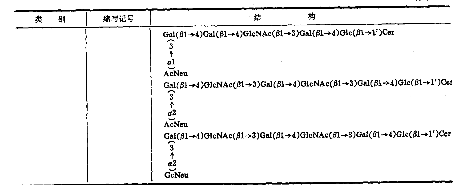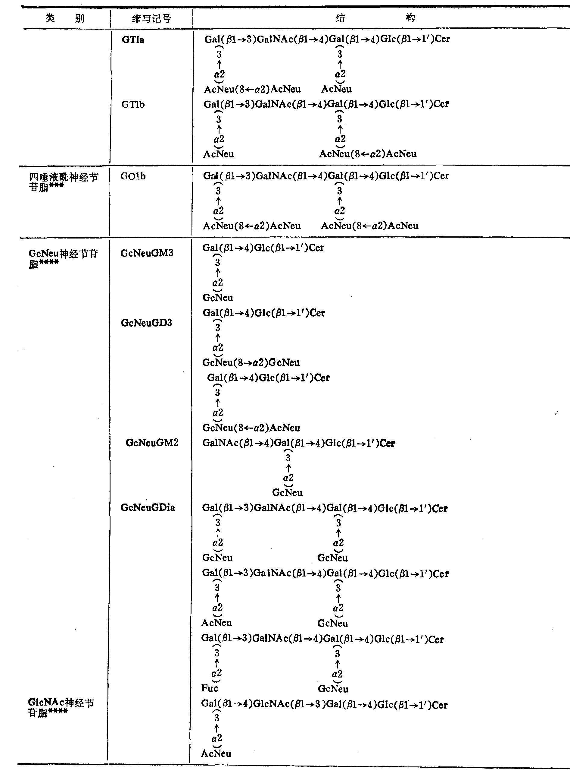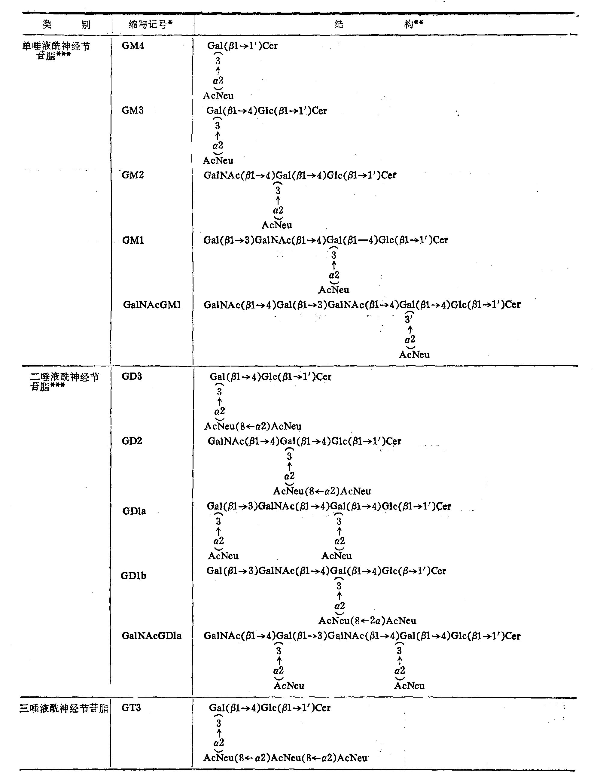 *按Svennexhalm **AcNeu: N乙酰神经氨酸基(即唾液酰基)GcNeu: N羟乙酰神经氨酸基;其他与上表相同 ***这类神经节苷脂主要存在于动物脑组织。 ****这类神经节苷脂主要分布于神经组织以外的各种组织,但在人体尚未发现GcNeu神经节脂苷类。