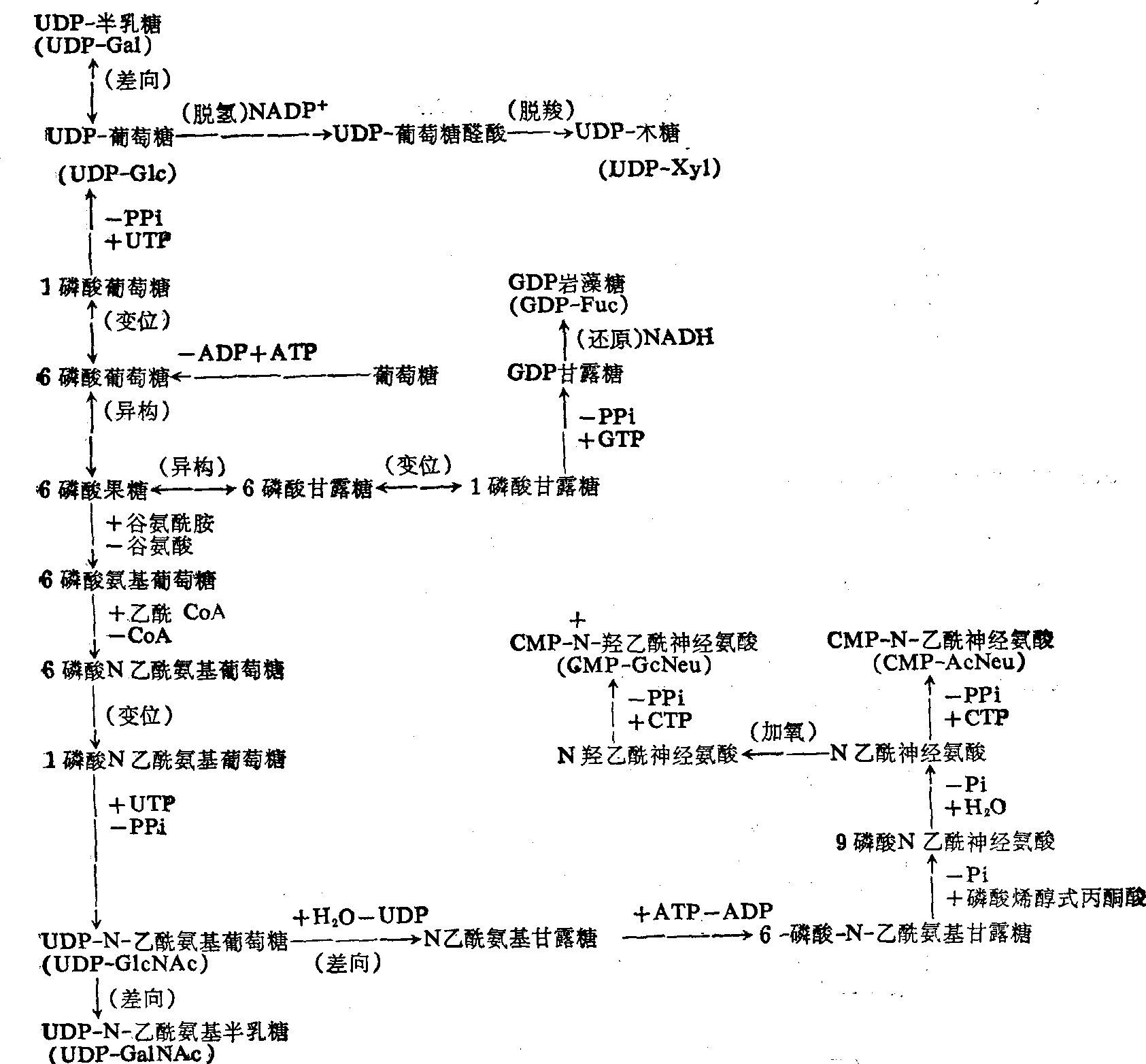 图1 各种糖基单核苷酸的生成途径 (1) 糖基单核苷酸类的合成: 参与糖脂合成的各种糖,首先需要激活成为单核苷酸衍生物,其转变途径大致如图1。 (2) N-酰鞘氨醇类的合成,长链脂酰辅酶A和丝氨酸缩合及脱羧成了酮二氢鞘氨醇,还原为二氢鞘氨醇,再脱氢生成鞘氨醇类,再进行酰化即可形成N-酰鞘氨醇类。离体实验认为,机体内进行的酰化反应有两种,而在生理情况下以微粒体酶系途径为主。 (3) 鞘糖脂的合成. 机体内单糖基鞘糖脂的合成可有两种方式,一是N-酰鞘氨醇的糖化,由糖基转移酶类催化进行,糖基直接来自糖基单核苷酸,即鞘氨醇先N-酰化后糖基化; 二是糖基鞘氨醇的酰化,即鞘氨醇先被糖基单核苷酸糖化,然后被脂肪酰CoA酰化。动物组织内可能以前者为主。 单糖基糖脂又可以在多种糖基转移酶(半乳糖基转移酶、葡萄糖基转移酶、岩藻糖基转移酶、N乙酰氨基葡萄糖基转移酶、N乙酰氨基半乳糖转移酶以及N-乙酰神经氨基转移酶等) 的作用下进一步糖化,逐渐加长糖链,合成不同的糖脂。硫脂类是在硫酸转移酶作用下进行硫酸酯化的,3’磷酸腺苷-5’-磷酰硫酸是硫酸基供体。 鞘糖脂的分解 组织中的鞘糖脂在多种水解酶的共同作用下可以逐步分解。这些酶主要有: 芳基硫酸酯酶(有A、B、C三种)、β-葡萄糖苷酶 (有膜结合性和可溶性两种)、β-半乳糖苷酶(有Ⅰ、Ⅱ两种)、α-半乳糖苷酶(有A、B两种)、α-岩藻糖苷酶、β-N-乙酰氨基己糖苷酶(有A、B、C三种)、N-乙酰神经氨酸酶(唾液酸酶)以及N-酰基鞘氨醇酶等。这些酶主要分布于溶酶体中,但血清等体液中也含少量。高等动物体内的各种糖苷酶通常全属外切糖苷酶,只能作用于糖脂中糖链的非还原末端苷键,对组成糖苷键的糖的种类和α,β构型具有特异性。 糖脂的生物学功能 糖脂只是由糖与脂两类物质组成,故具有与磷脂相似的兼溶性特性,是构成某些生物膜的原料。此外,糖脂所含的糖不只一种,链长不一,其中单糖的排列顺序亦有别,而且其间的连接键的位置也不尽相同,足见糖链的种类各式各样,因此其生物学性质和功能就各具特点。