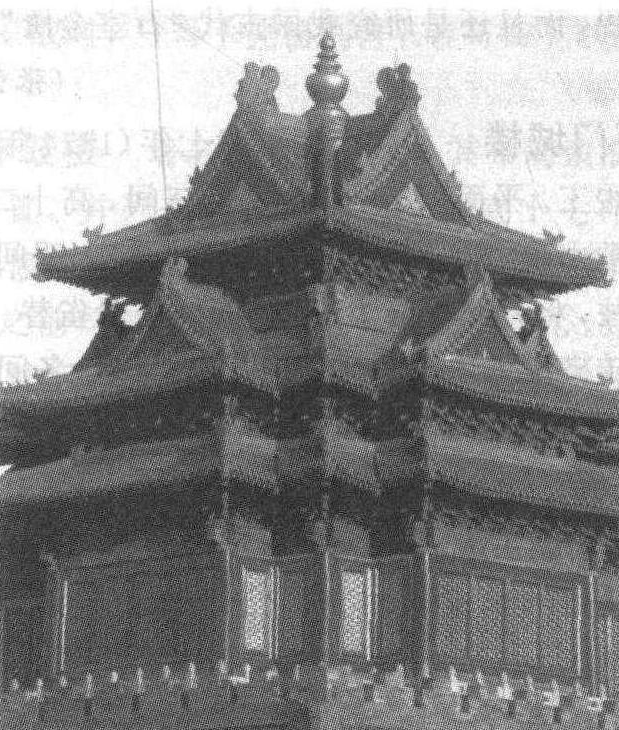 明清紫禁城(宫城)平面东西宽七百五十米,南北长九百六十米之矩形。周以高约十米之砖砌城垣,四隅建有曲尺形平面角楼,墙外更置五十二米宽的护城河。角楼本为防守瞭望而设,先秦记载即有角楼,以后历代相沿不废。据陶宗义《辍耕录》载,元代大都宫城四隅建有四个角楼,“皆三趓楼,琉璃瓦饰檐脊”。明清紫禁城角楼建筑形式复杂、华丽。角楼的高度从城台算起约十七米,屋顶部分为露明檐柱的两倍高。屋顶为两个歇山式屋顶垂直相交咬合而成的十字脊,四面露出山花,脊端各有一个鸱吻。十字脊正中置一铜镀金宝顶。四面山花下面为四面坡的腰檐,檐下方各有一座与中心连在一起的重檐歇山式抱厦。抱厦与抱厦的重檐之间,又伸出两面坡的檐角,如此下面的重檐就形成二十四个翼角。据统计,角楼共有一个宝顶,十个鸱吻,七十二条脊,二十八个翼角,二十根柱,八扇门,三十六扇窗,上下共五十四面曲线屋顶(包括腰檐),是一座多面多角多门多窗,并组织得十分和谐、统一的高超艺术建筑。